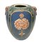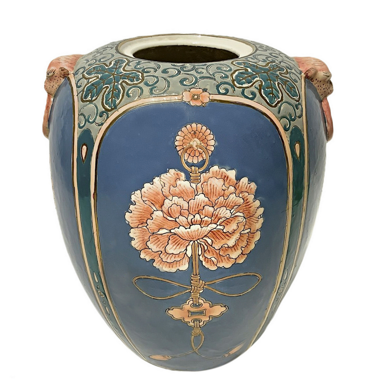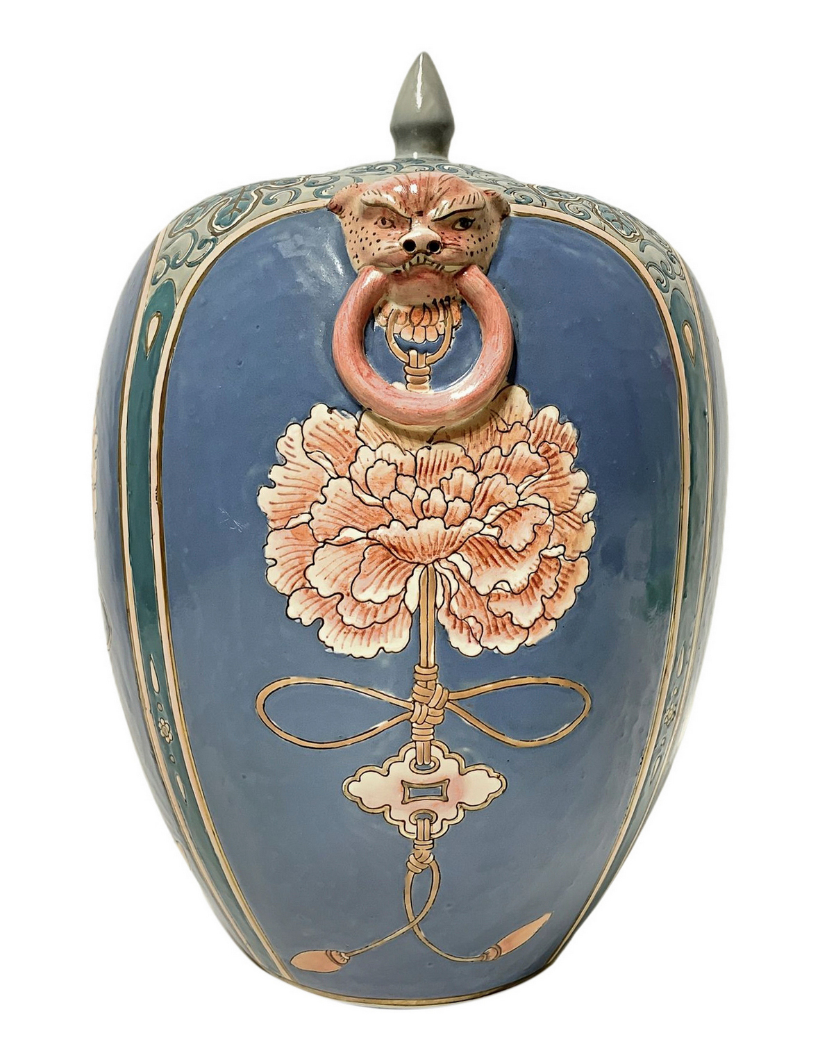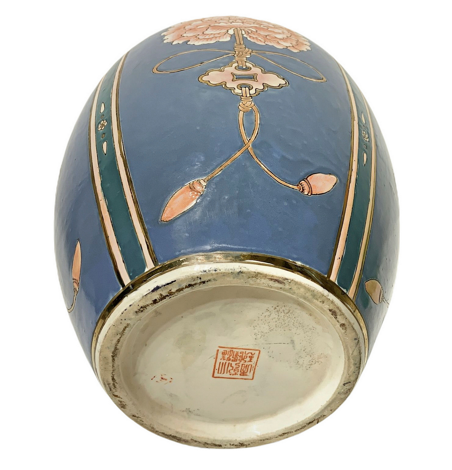 Vaso potiche cinese fondo azzurro con decori floreali rosa. H cm 28