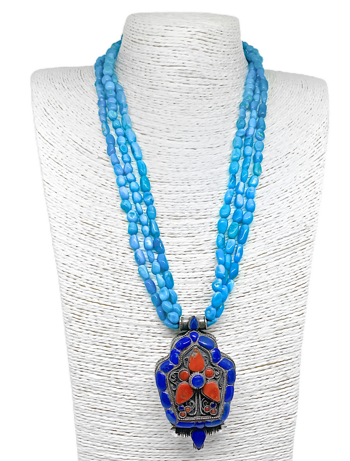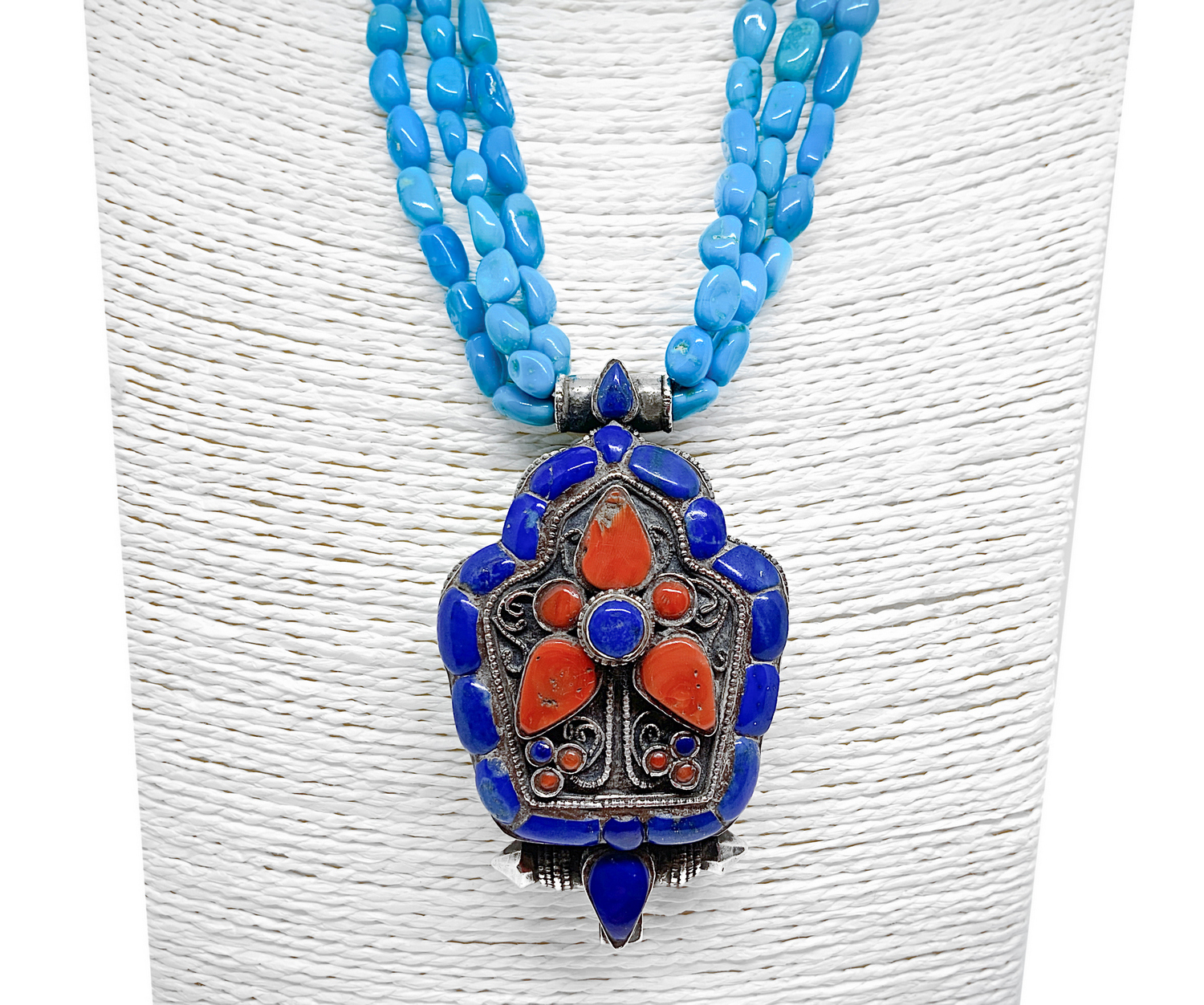 Collana 3 fili Turchese Arizona. centrale in Argento con Lapislazzuli e Corallo. Chiusura in Argento.