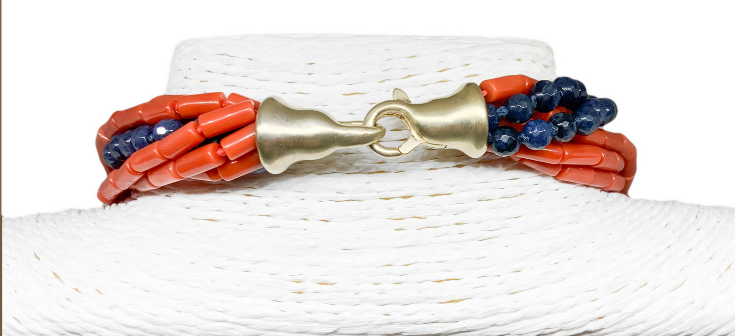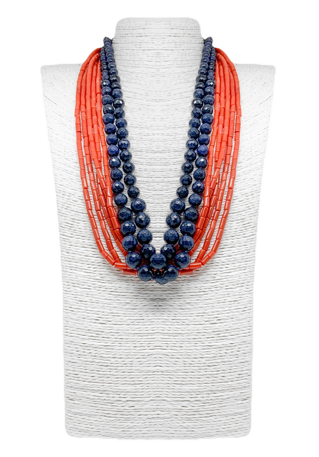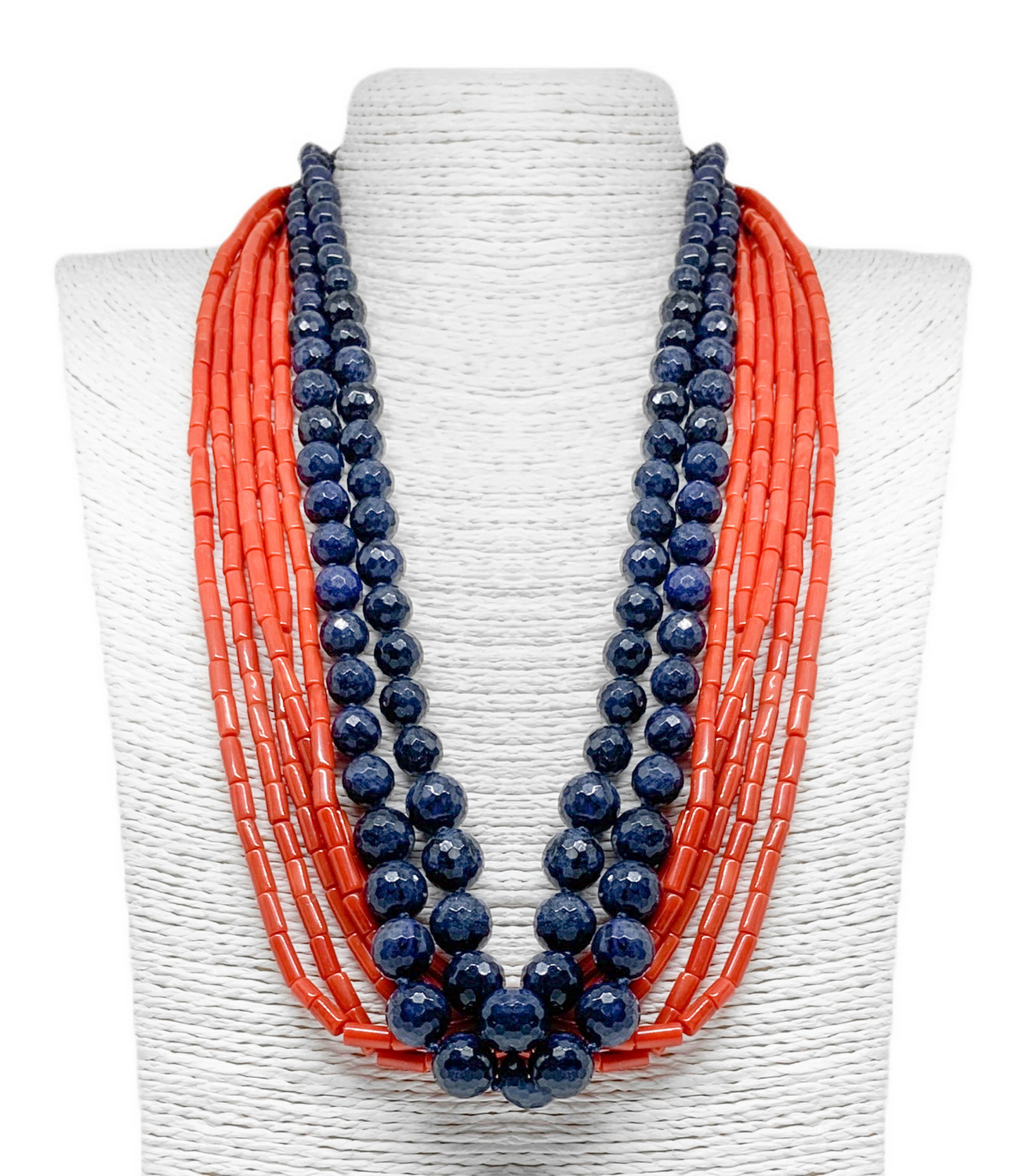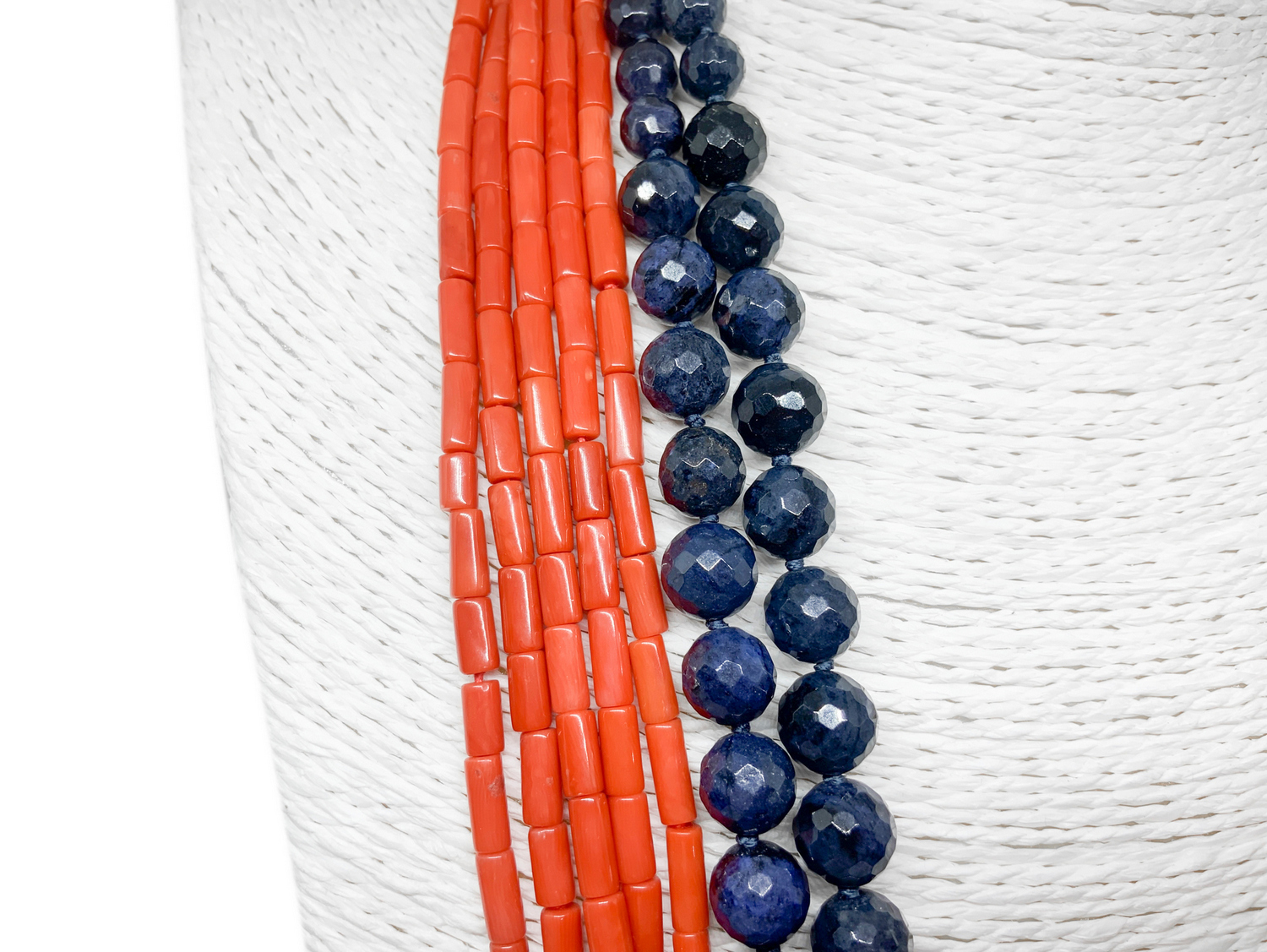 Collana con due fili di ZAFFIRO opaco sfera sfaccettata a digradare da mm 3 a mm 12. più cinque fili di CORALLO a tubicini mm 3,5, chiusura in Argento laccato Oro satinato.