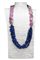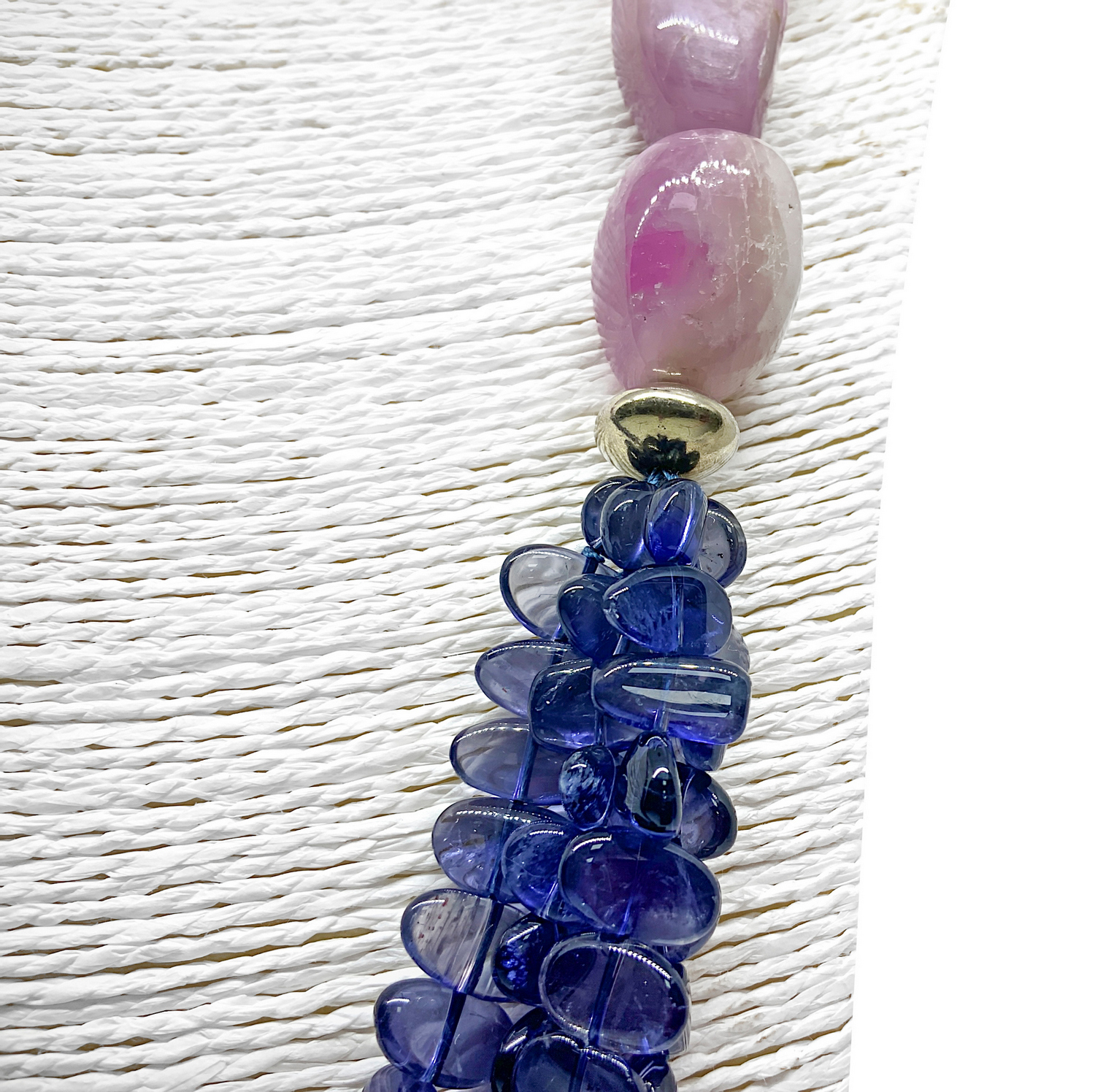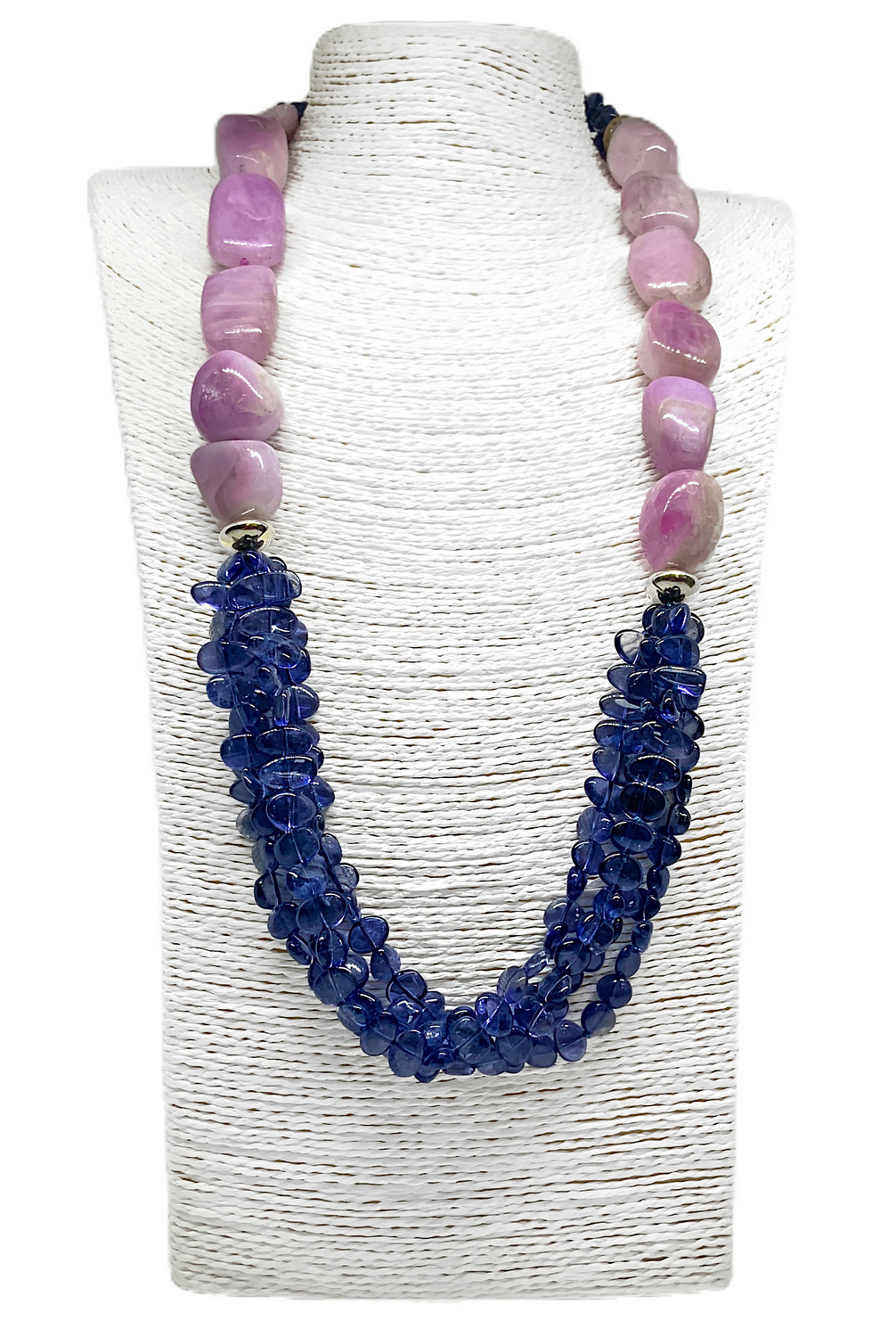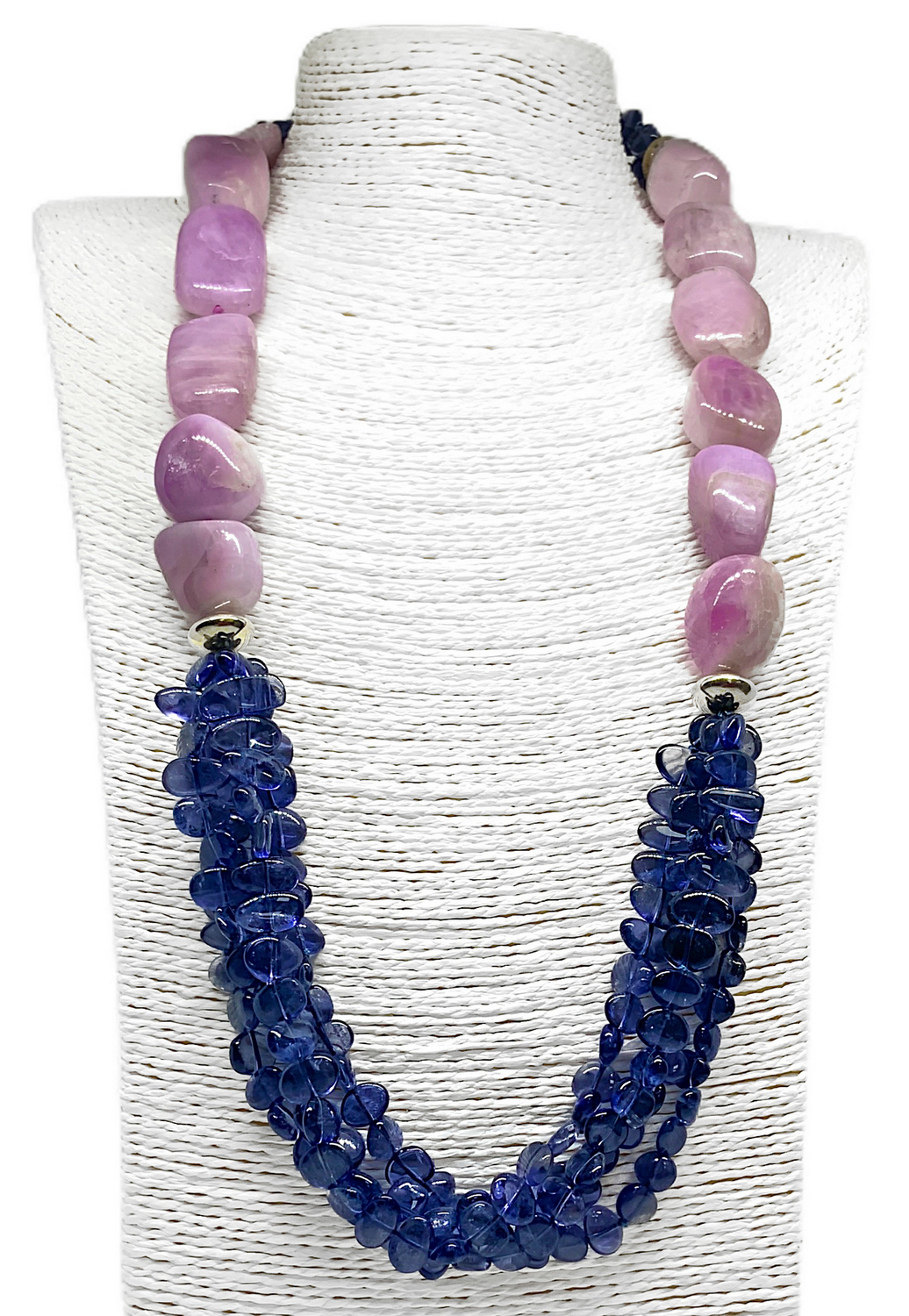 Collana con quattro più quattro. fili di ovalini di IOLITE (blu) più due fili di KUNZITE (rosa).