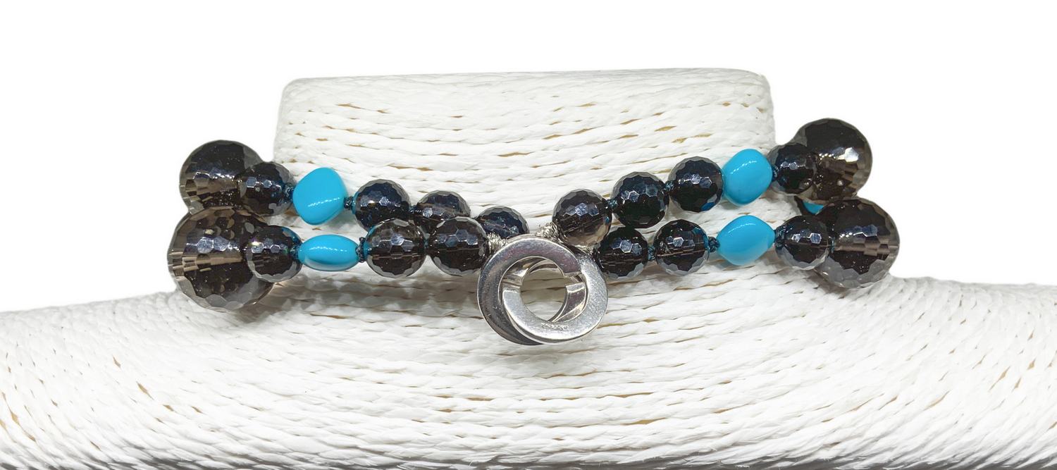 Collana con sfere sfacc, di QUARZO FUMÈ' mm 16, più elementi di TURCHESE. Chiusura in Argento.