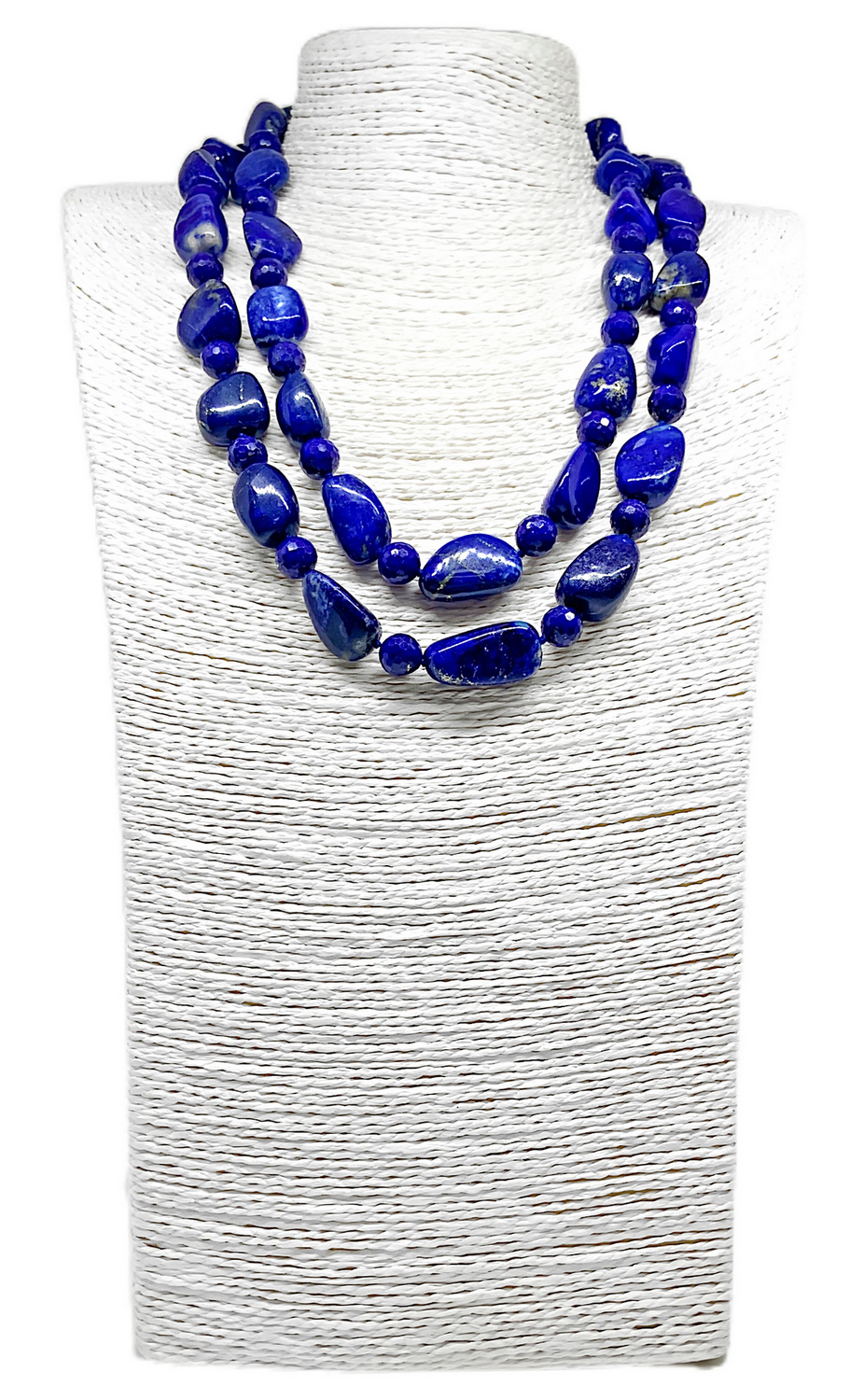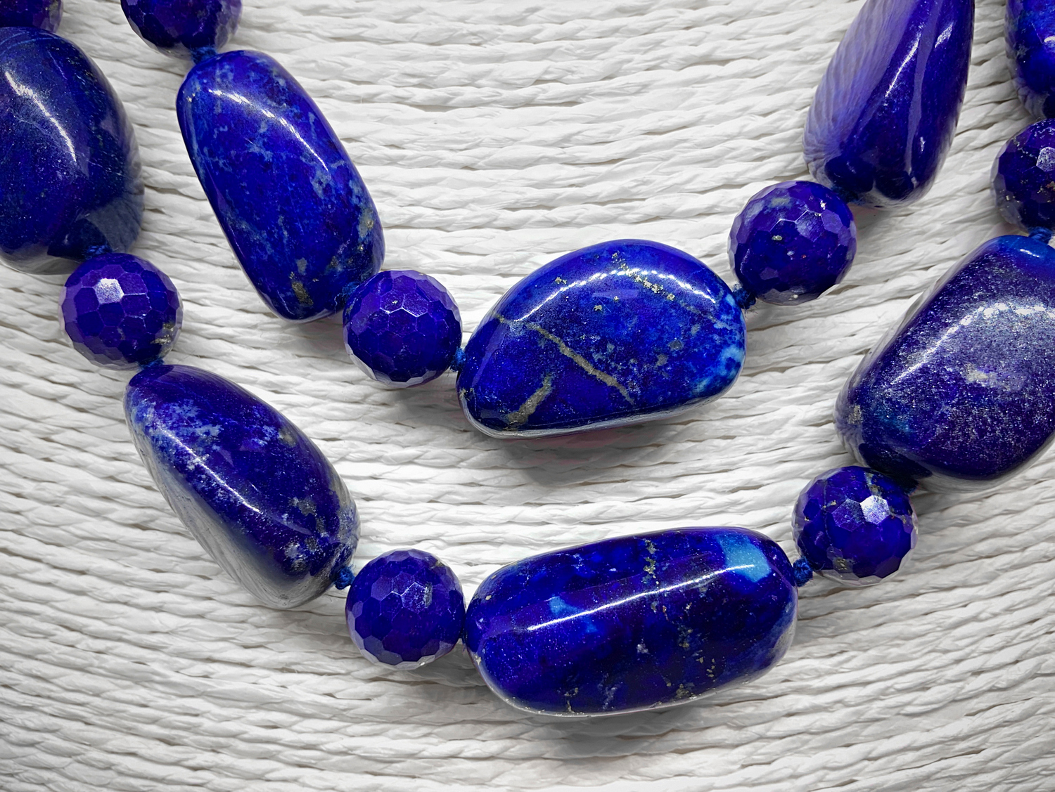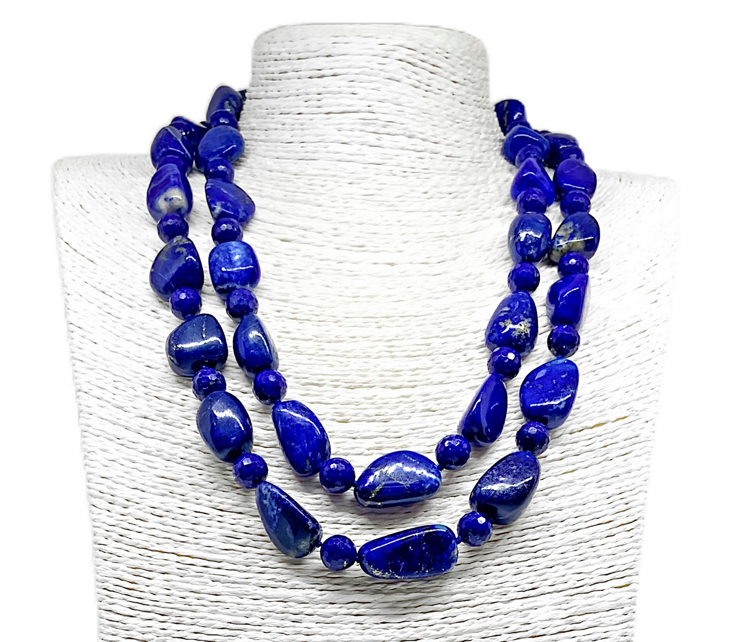 Collana due fili lapislazzuli a sfere sfaccettate alternate a sasso liscio....