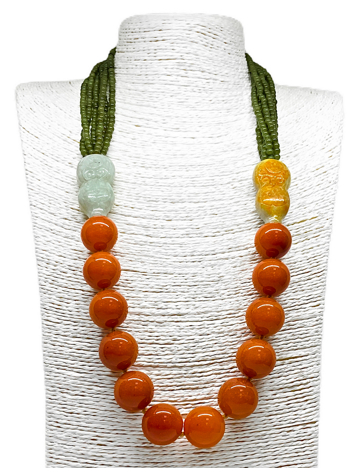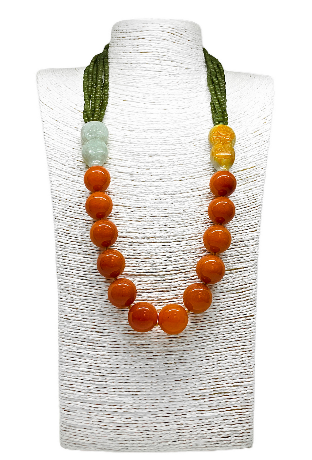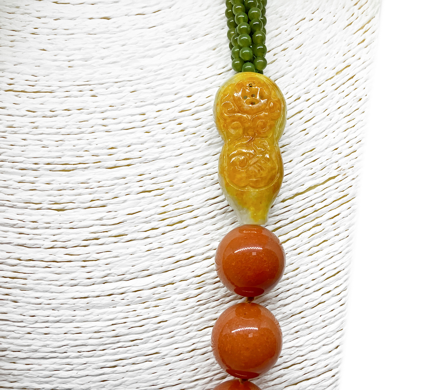 Collana sei fili. AVVENTURINA (verde) sfera liscia , diametro mm 3, due divisori in GIADA, più un filo di EOSITE /Avventurina arancione), sfere mm 20.