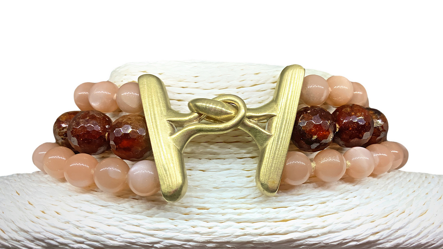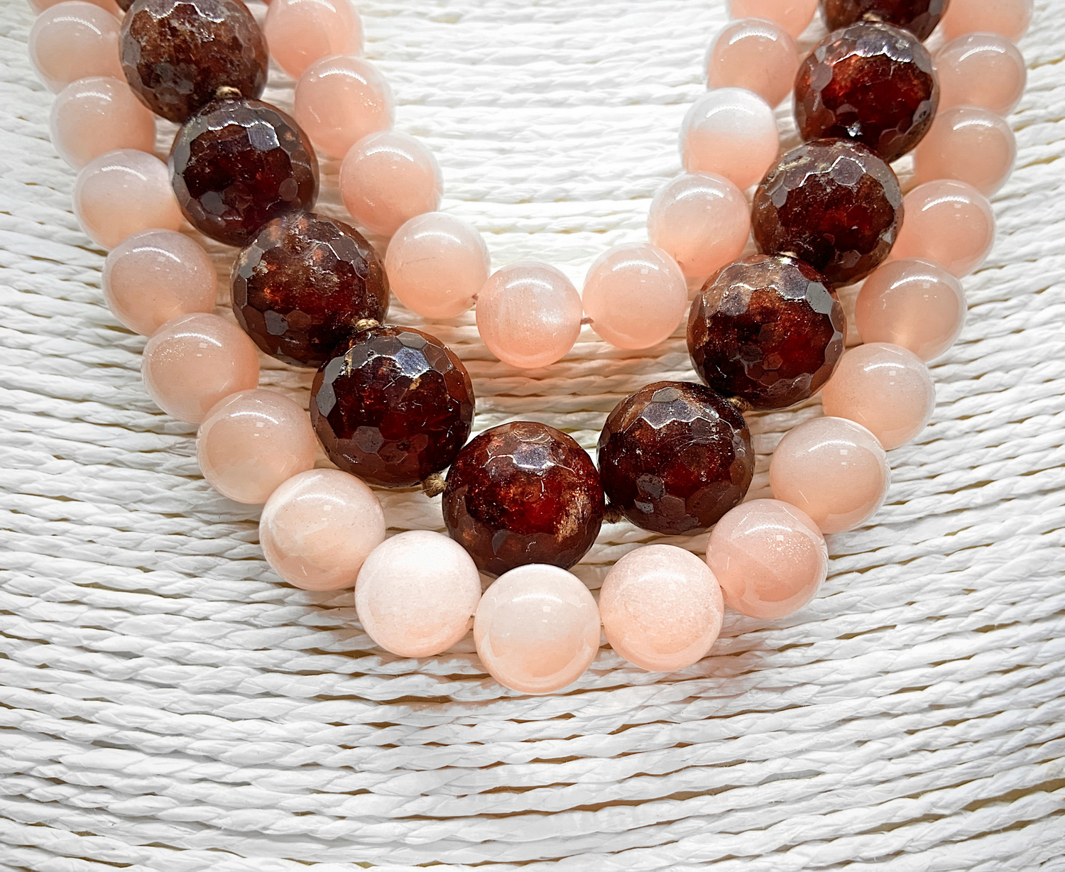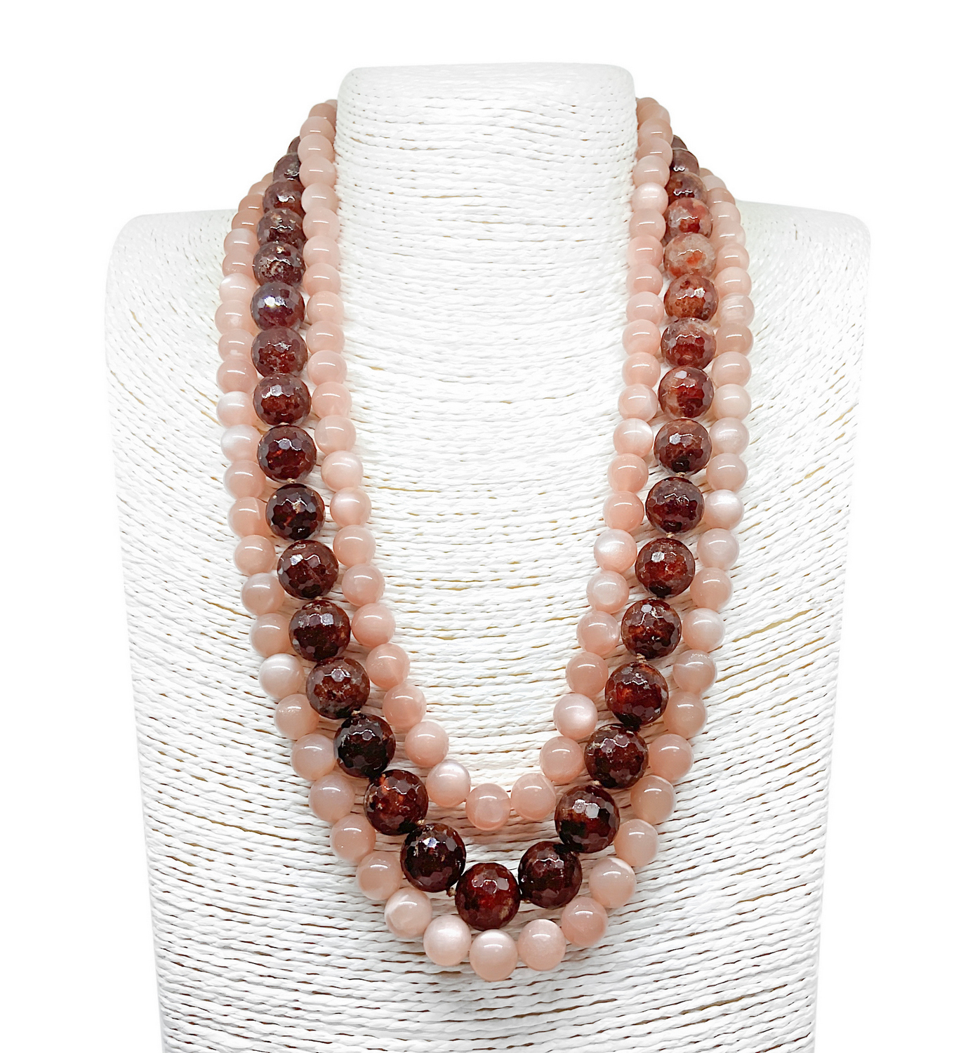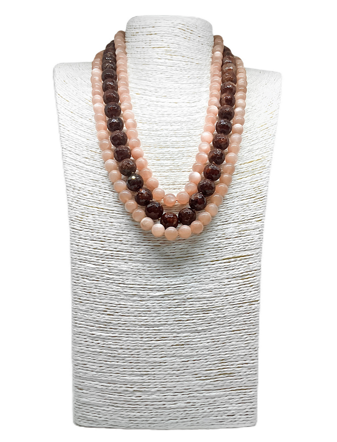 Collana tre fili. due fili Pietra di Luna Moonstone (c. colore nocciola chiaro) mm 10, sfera liscia più filo centrale GRANATO marrone, Piropo, sfera sfaccettata mm 12. Chiusura Argento laccato Oro, Satinato.