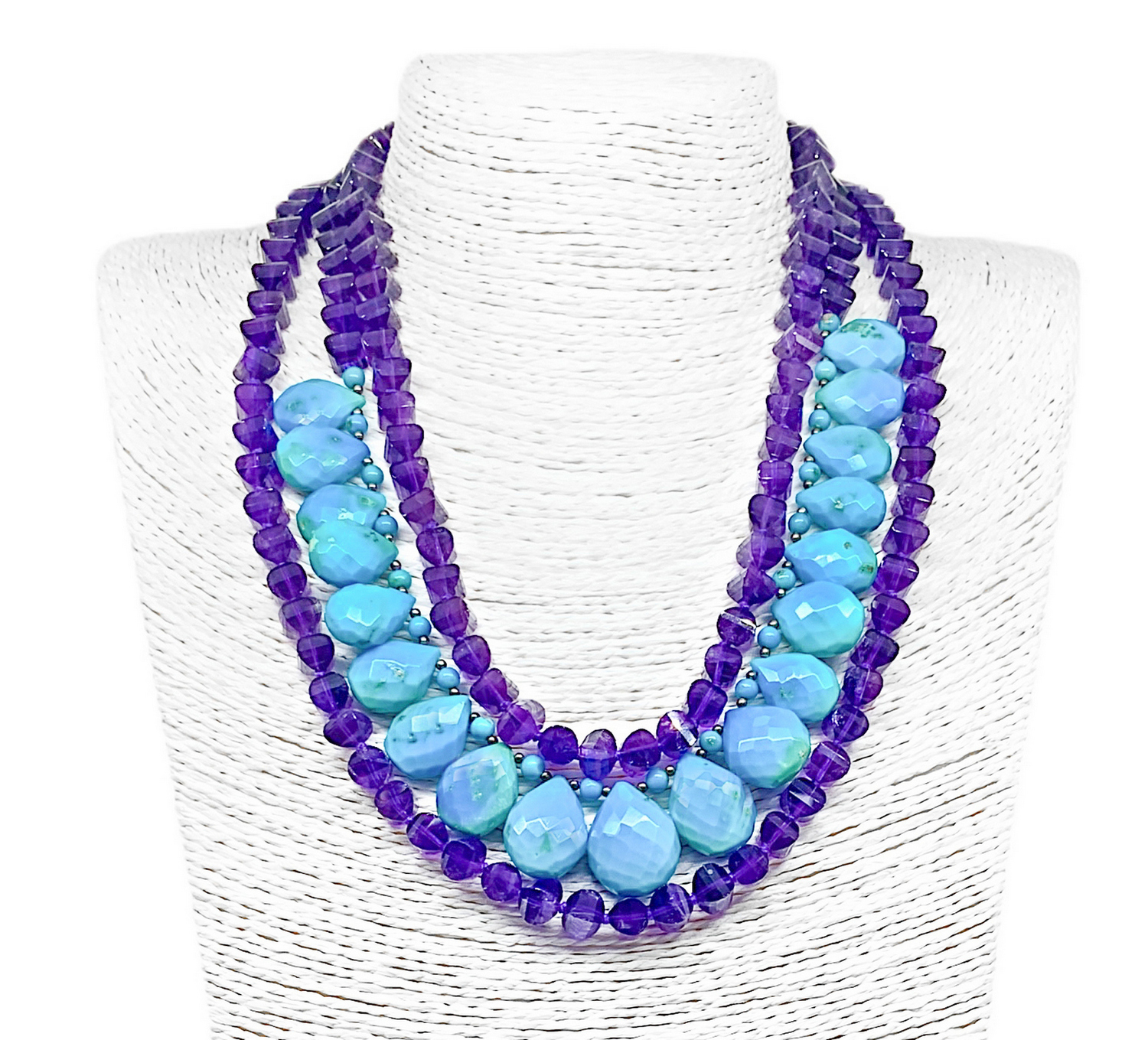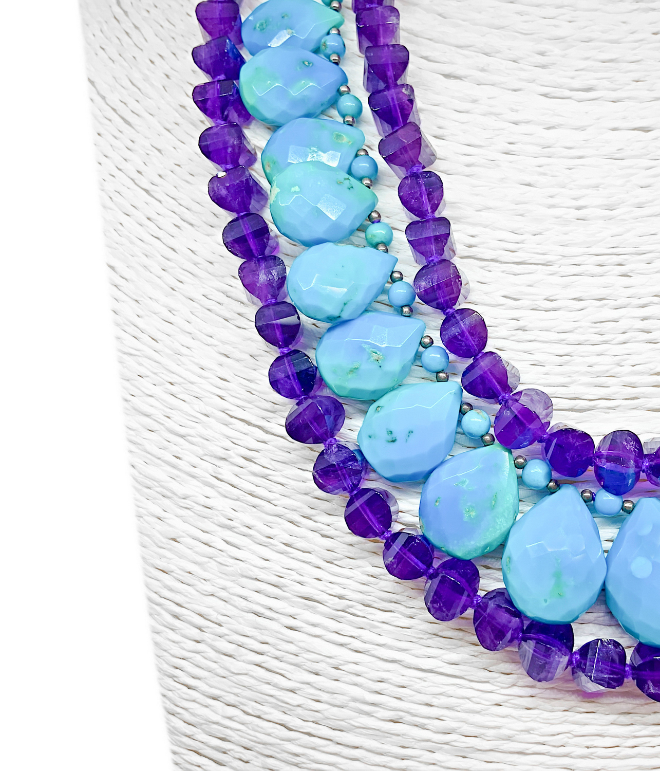 Collana tre fili di AMETISTA sfaccettata mm 8, con al centro gocce di TURCHESE ARIZONA. chiusura in Argento satinato.