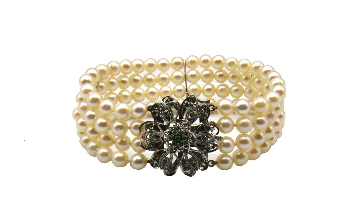 a quattro fili di perle giapponesi coltivate, di 6 mm, con preziosa chiusura in oro bianco 18kt, impreziosita da smeraldi naturali taglio rotondo, per 0,24 ct circa.