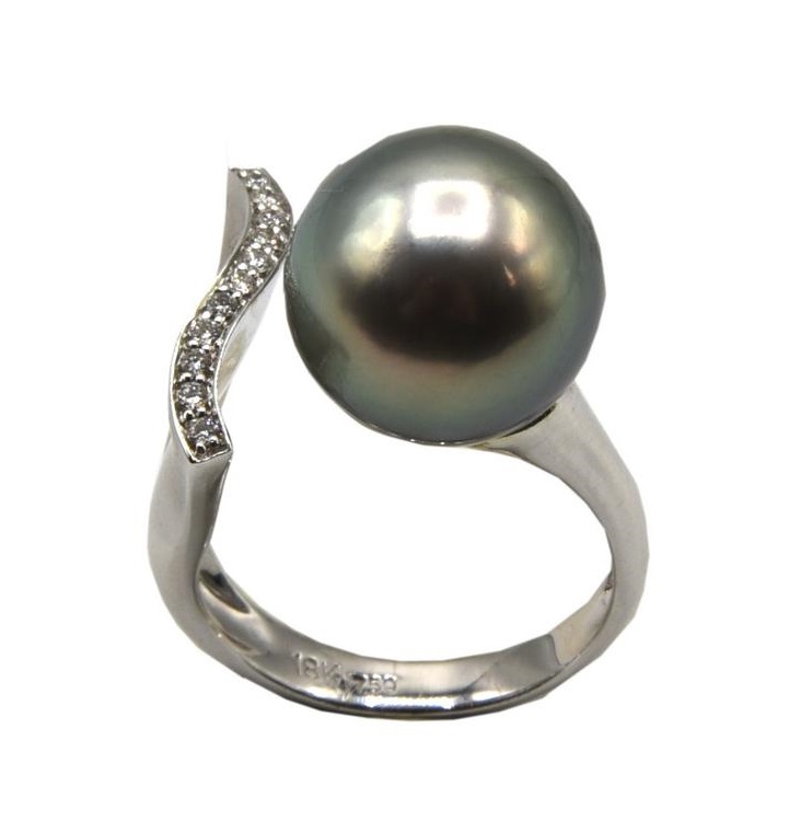 in oro bianco 18kt, con perla grigia Tahiti di 13 mm e diamanti per 0,10 ct circa.