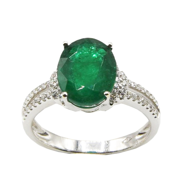 in oro bianco 18kt, con al centro smeraldo colombiano ovale di 2,58 ct circa, impreziosito da diamanti taglio brillante per 0,23 ct circa.