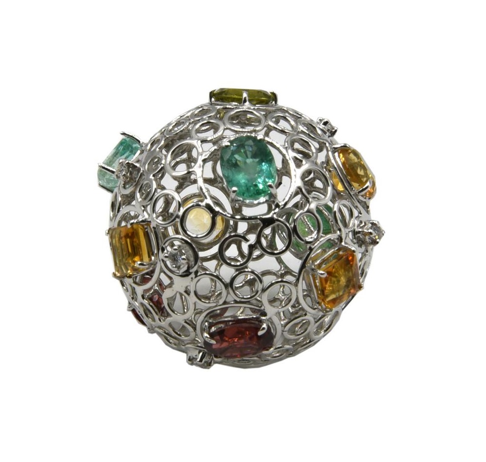 PENDENTE A SFERA TRAFORATA CON PERIDOTI, GRANATI E CITRINI in oro bianco...