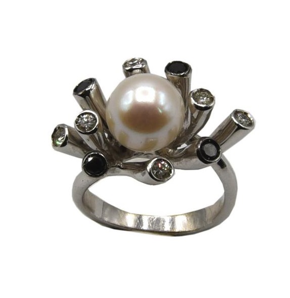 in oro bianco 18kt, con al centro perla sferica giapponese Akoya, colore bianco, di 9,5 mm, circondata da diamanti taglio brillante per 0,40 ct circa e diamanti colore nero per 0,20 ct circa.