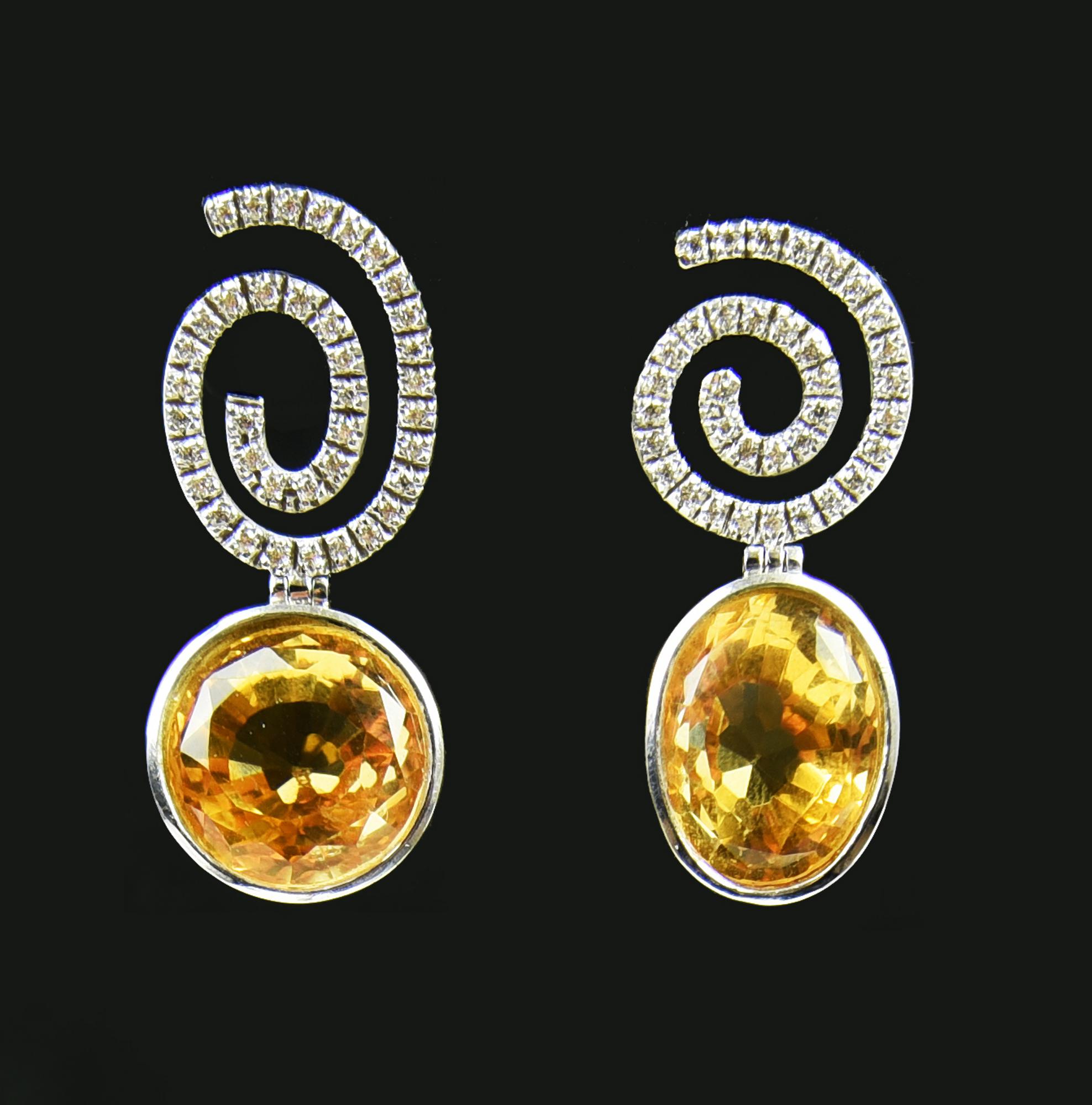in oro bianco 18kt, a pendente a spirale alternati impreziositi da diamanti taglio brillante per 0,50 ct circa e due citrini naturali di forma rotonda e ovale.
