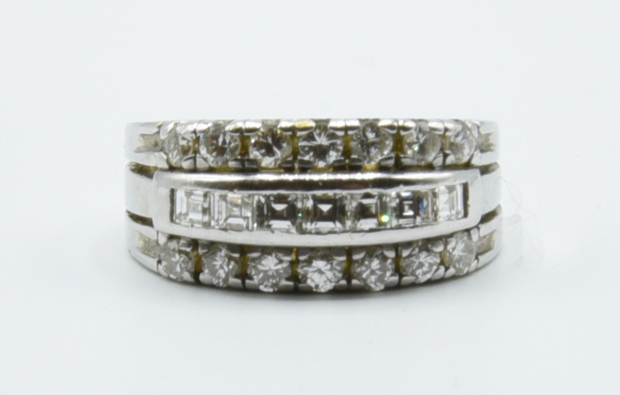 in oro bianco 18kt a fascia degrade', con al centro una fila di dimanti carre' e due file di diamanti, per 0,72 ct circa.
