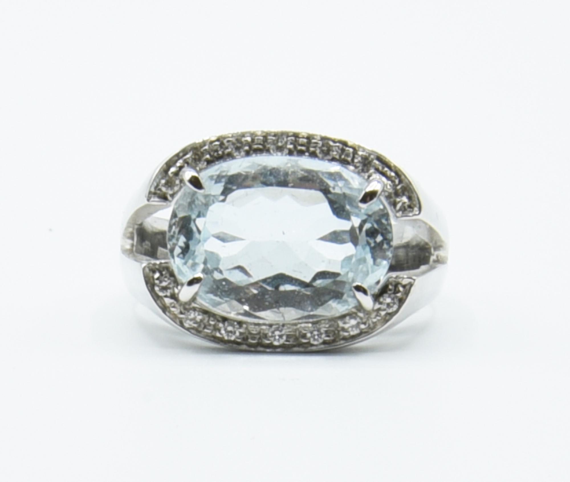 in oro bianco 18kt con al centro acquamarina ovale taglio composito, di 4,82 ct circa e circondata da diamanti per 0,09 ct circa.
