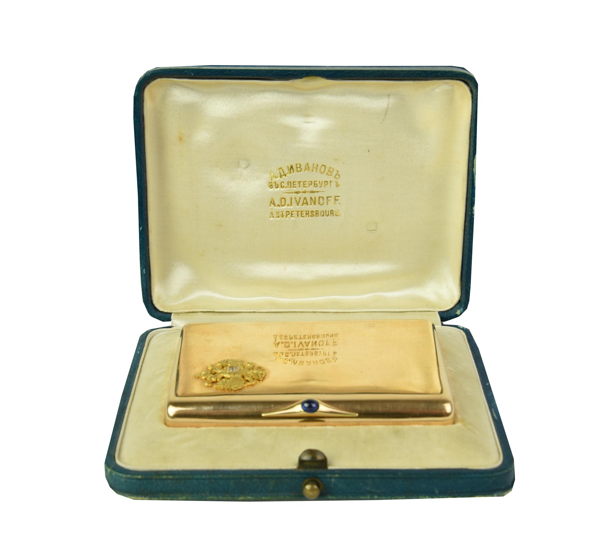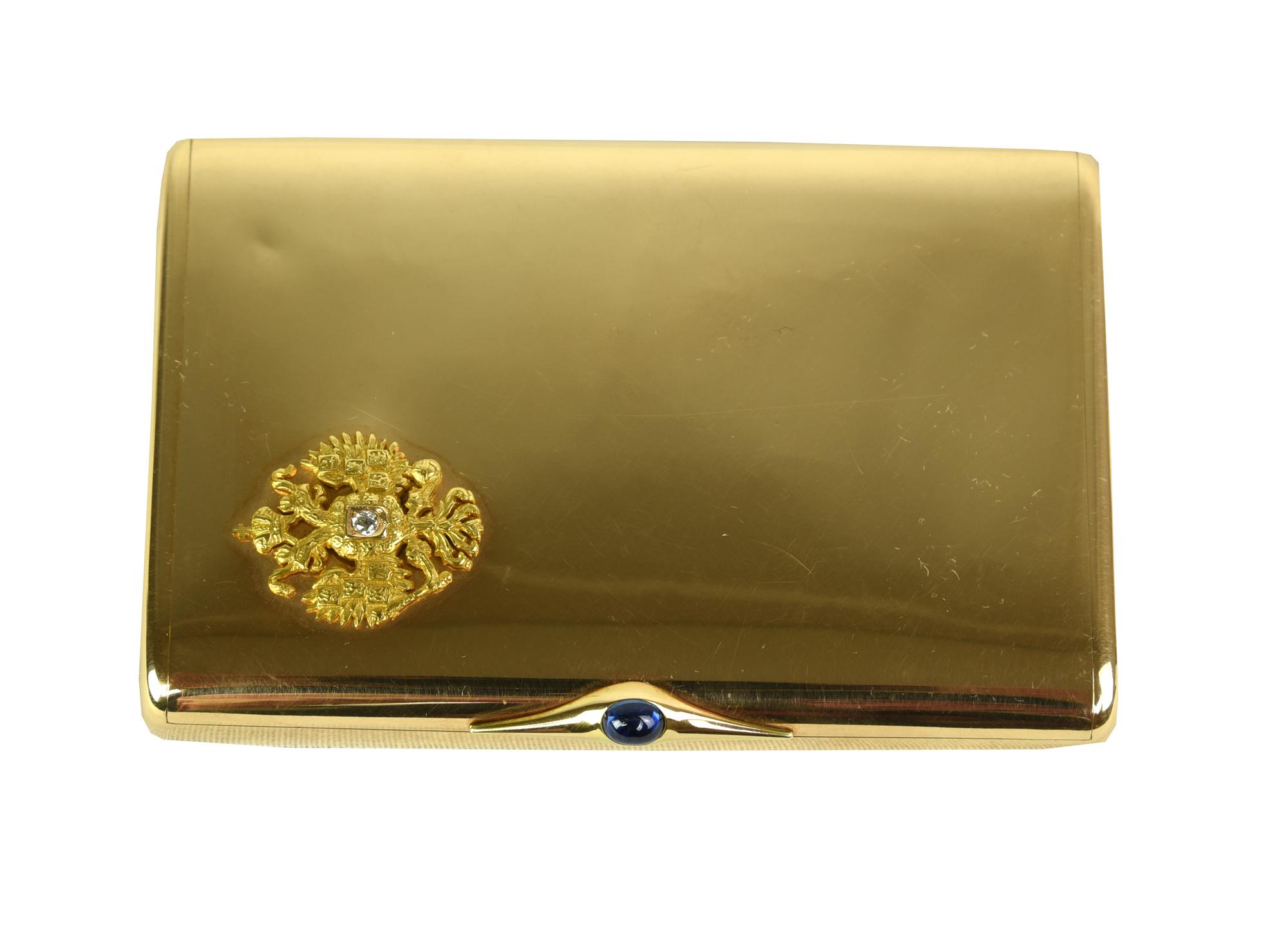 Portasigarette in oro rosa, facitore Alexander Dementievic Ivanoff, di forma rettangolare con angoli arrotondati e chiusura a scomparsa.Decorato sul coperchio con lo stemma imperiale in oro giallo, centrato da un brillante di 0,5 ct. circa e sulla presa di apertura da uno zaffiro cabochon di 0,25 ct circa.