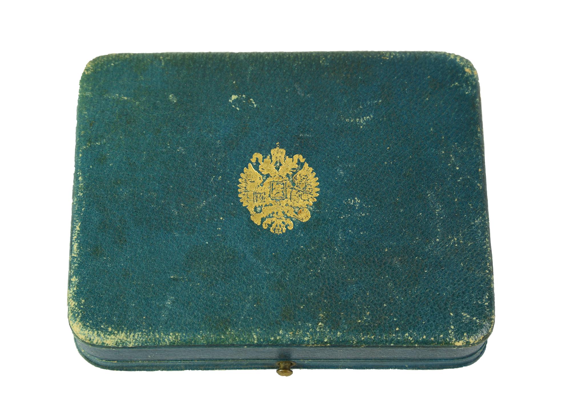 Completo di scatola originale in marocchino azzurro con lo stemma imperiale impresso in oro sul coperchio e marcata all'interno A.D. IVANOFF A' ST. PETERSBOURG