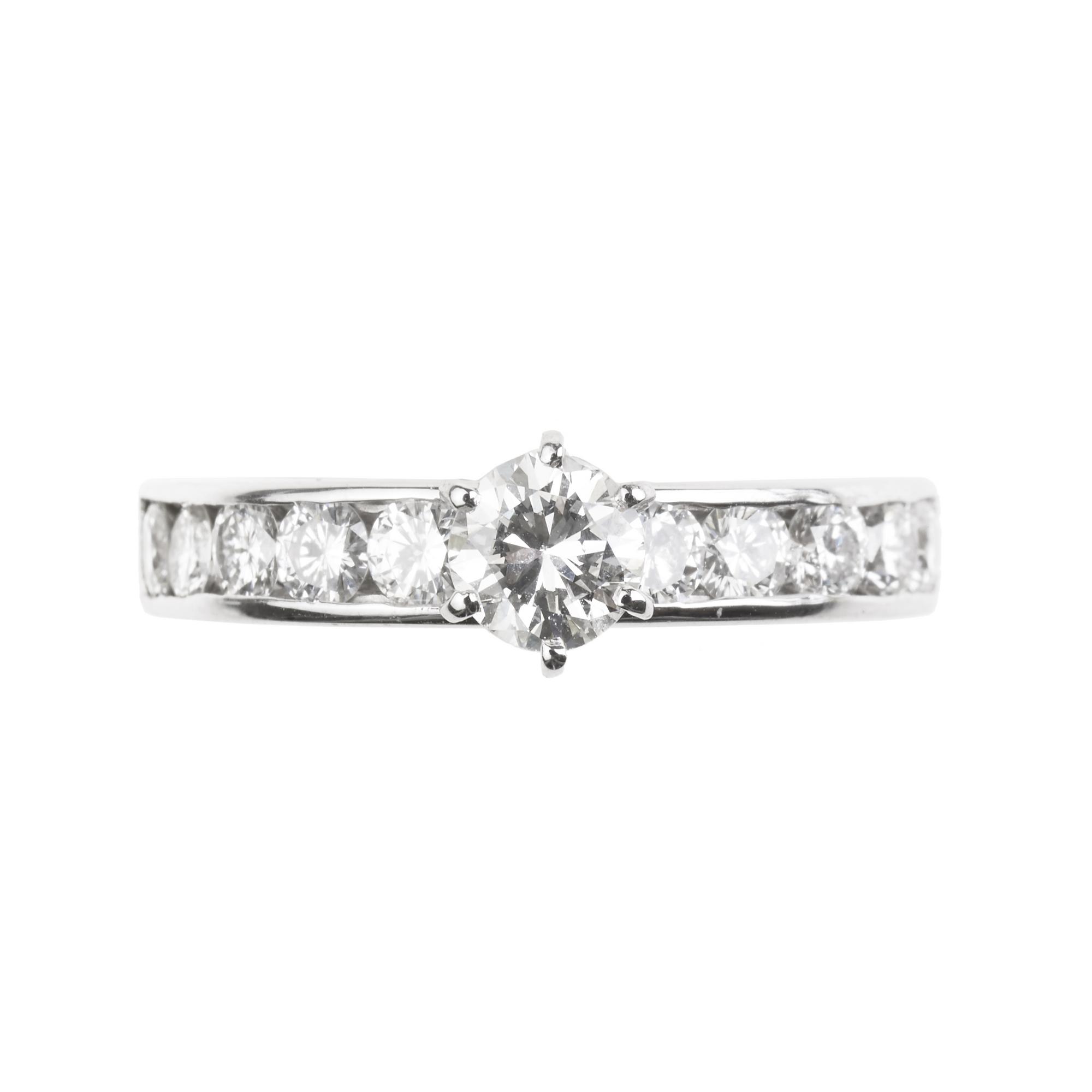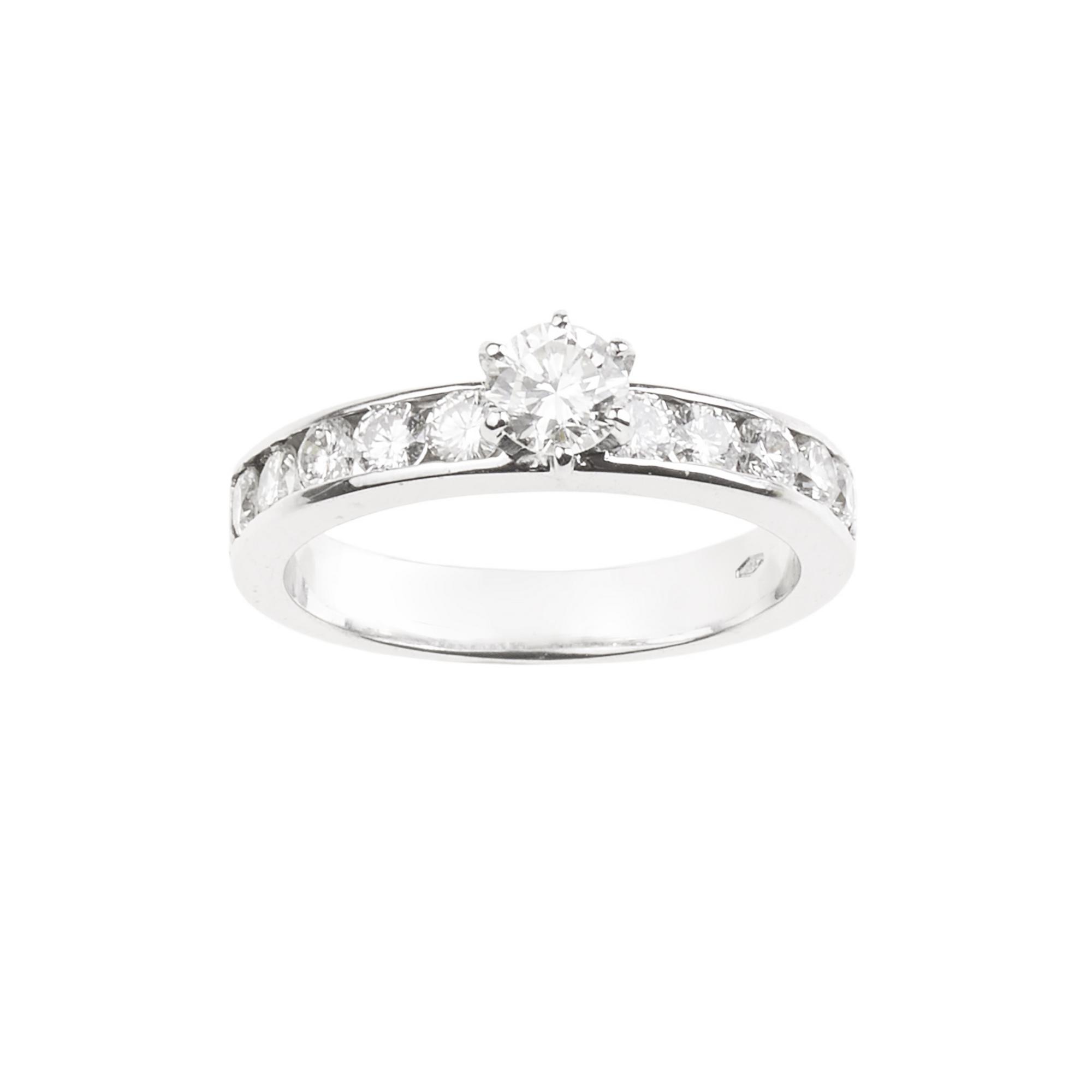 in oro bianco 18kt, al centro un diamante di forma rotonda a brillante di ct 0,52 circa, colore G, purezza VS2, impreziosito ai lati da dieci diamanti per ct 1 totali circa.