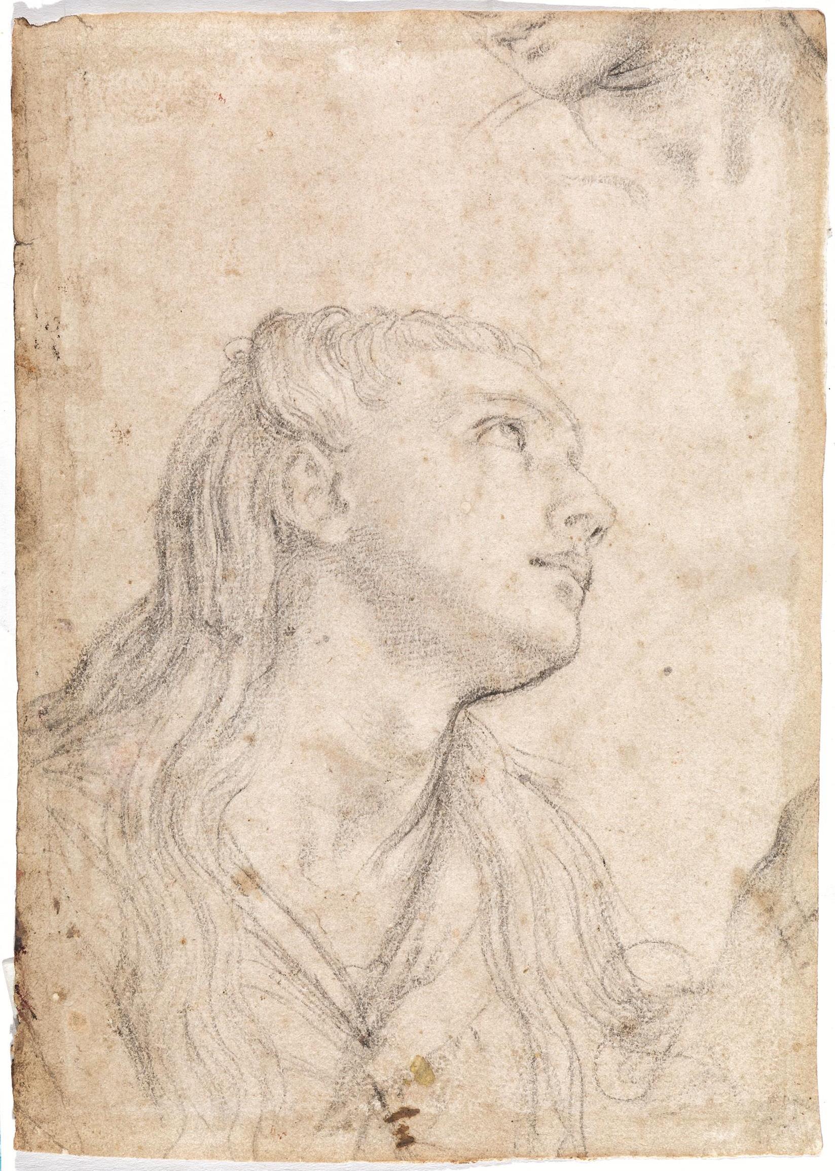 Il disegno propone un modulo consueto nella tradizione grafica e pittorica di Alessandro Allori. Lo stesso volto orante ricorre, con piccole varianti e offerto in piena figura, nel disegno a gessetto nero Donna seduta con libro aperto nella Collezione del British Museum (Inv. 1886.0609.33) che Nicholas Turner (Turner, 155) mette in relazione con la pala d’altare Cristo nella casa di Marta e Maria realizzata nel 1578 per la cappella di Palazzo Portinari-Salviati a Firenze (Lecchini Giovannoni, 69). E’ altresì evidente la stretta analogia sia con la Santa Maria Maddalena penitente del Museo Stibbert di Firenze (Lecchini Giovannoni, 159) del 1602 che con la seconda versione del Cristo nella casa di Marta e Maria (dove tuttavia la figura è in controparte rispetto al disegno) del 1605 proveniente dalla Collezione Medicea e oggi al Kunsthistorisches Museum di Vienna (Lecchini Giovannoni, 171).