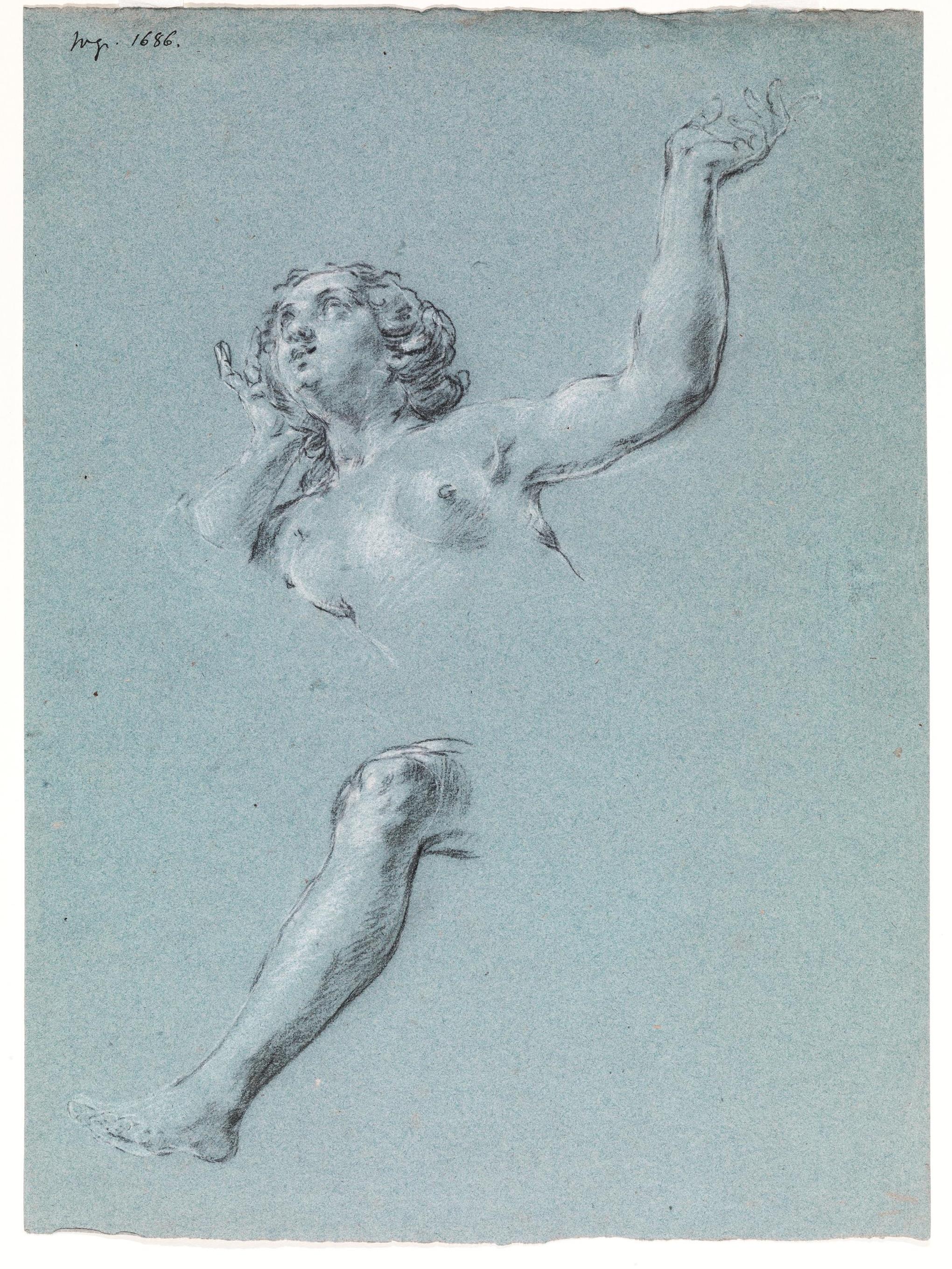 Studio preparatorio in controparte per la figura della musa seduta al fianco dell’Allegoria del Tempo nell’affresco La celebrazione di Enea, eseguito per il salone delle armi nel Palazzo Reale di Torino fra il 1738 ed il 1743 e per il quale Francesco Juvarra realizzò l’elaborato riquadro. La qualità ed il ductus grafico assimilano il presente foglio ai disegni dell’artista conservati al Museo Civico di Torino, molti dei quali preparatori per i lavori a Palazzo Reale.