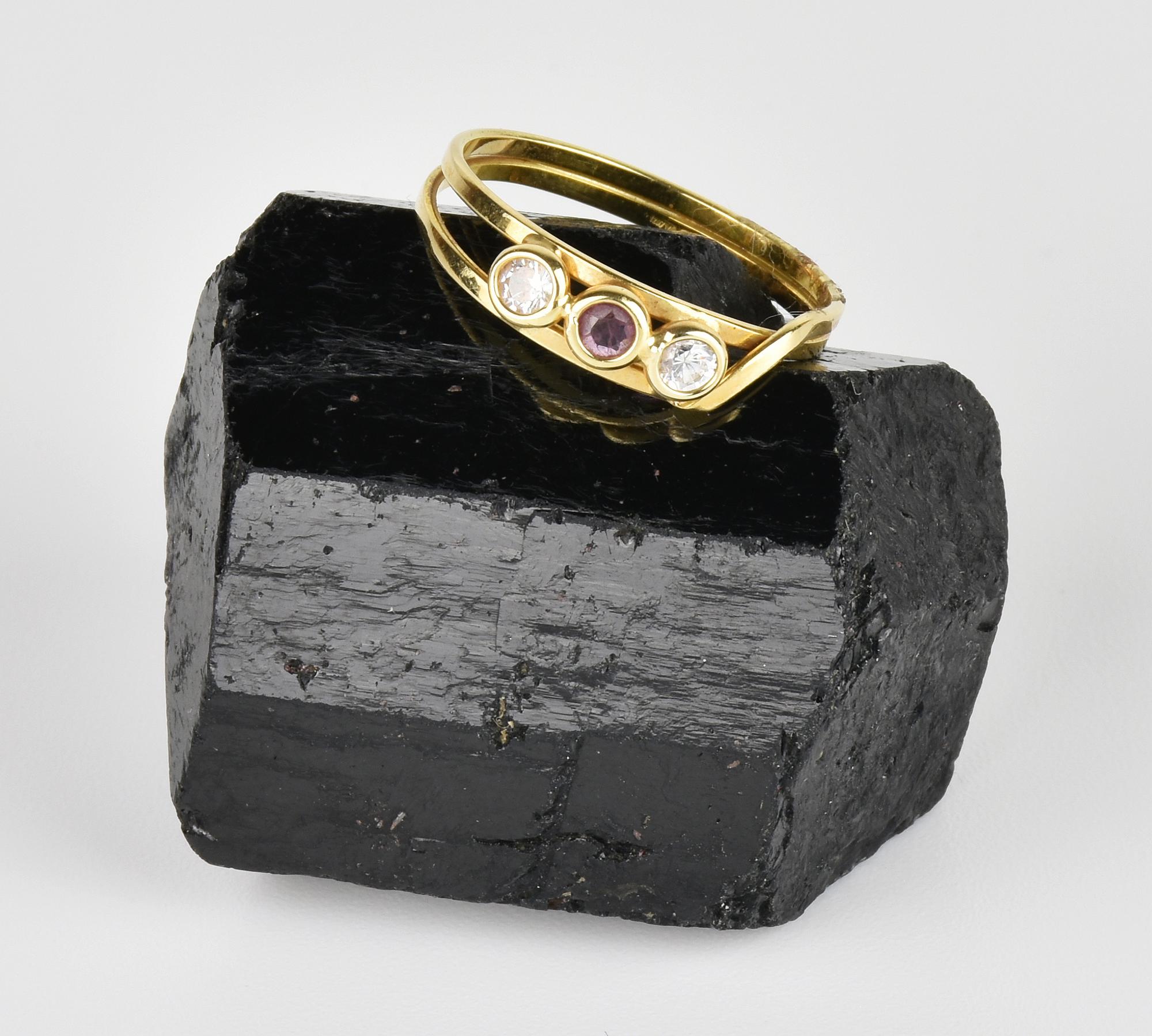 in oro giallo 18kt, con corindone di contorno centrale varieta' rubino e due piccoli diamanti di 0,05 ct ciascuno circa montati all'inglese.