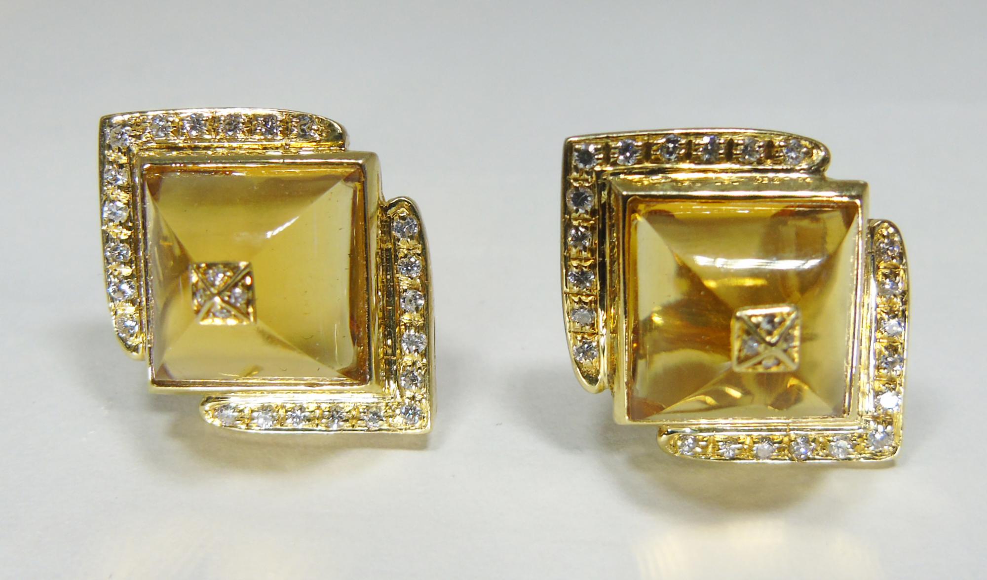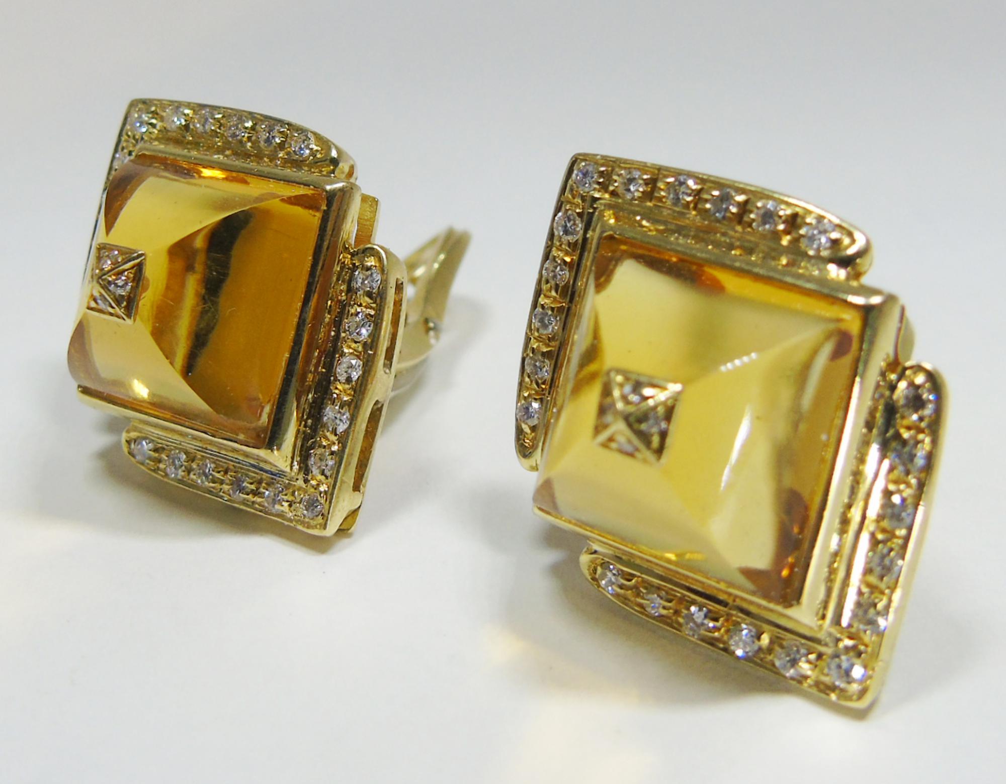 Orecchini in oro giallo 18kt, 13,70 gr., con al centro quarzo citrino e diamanti