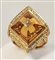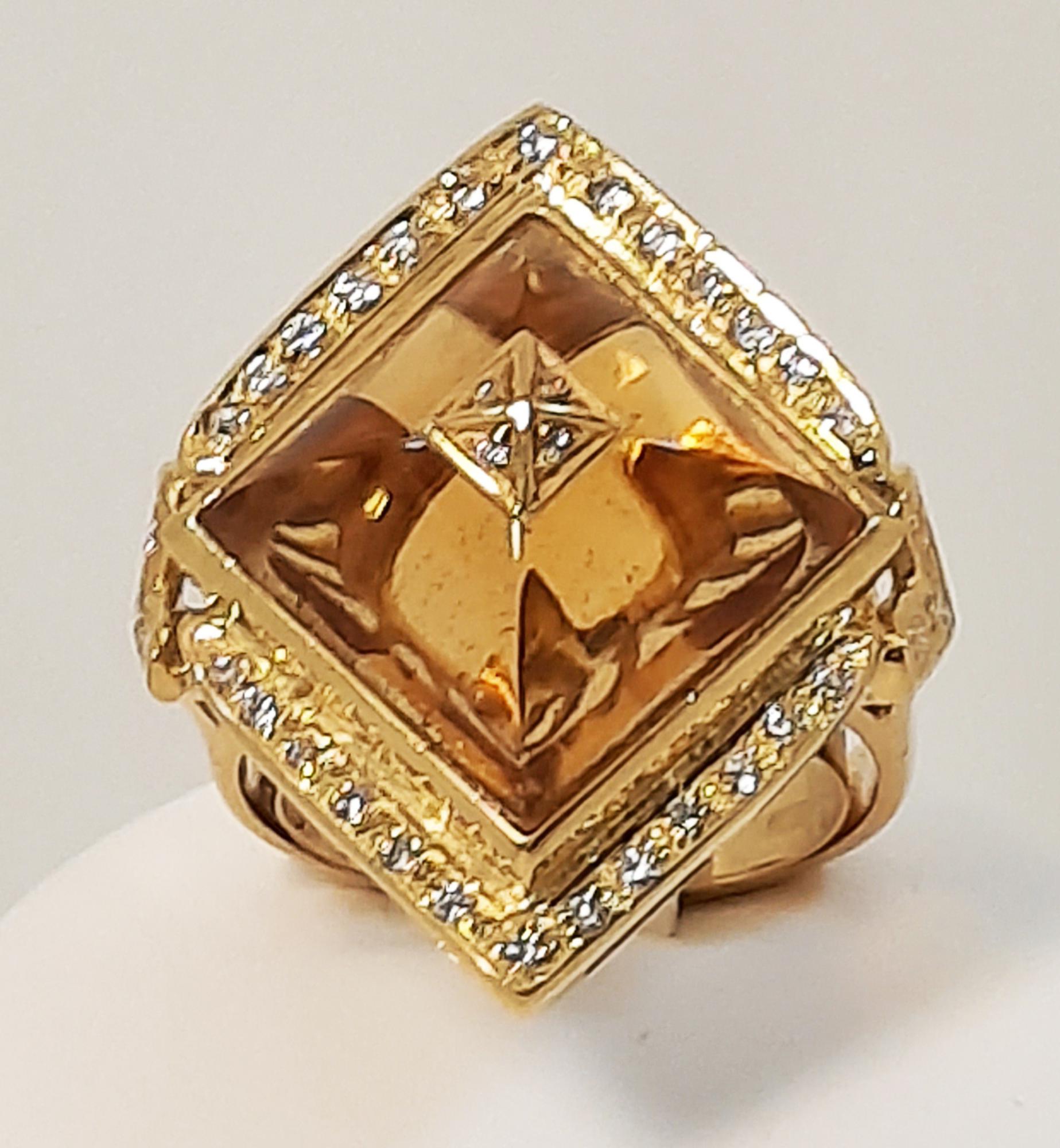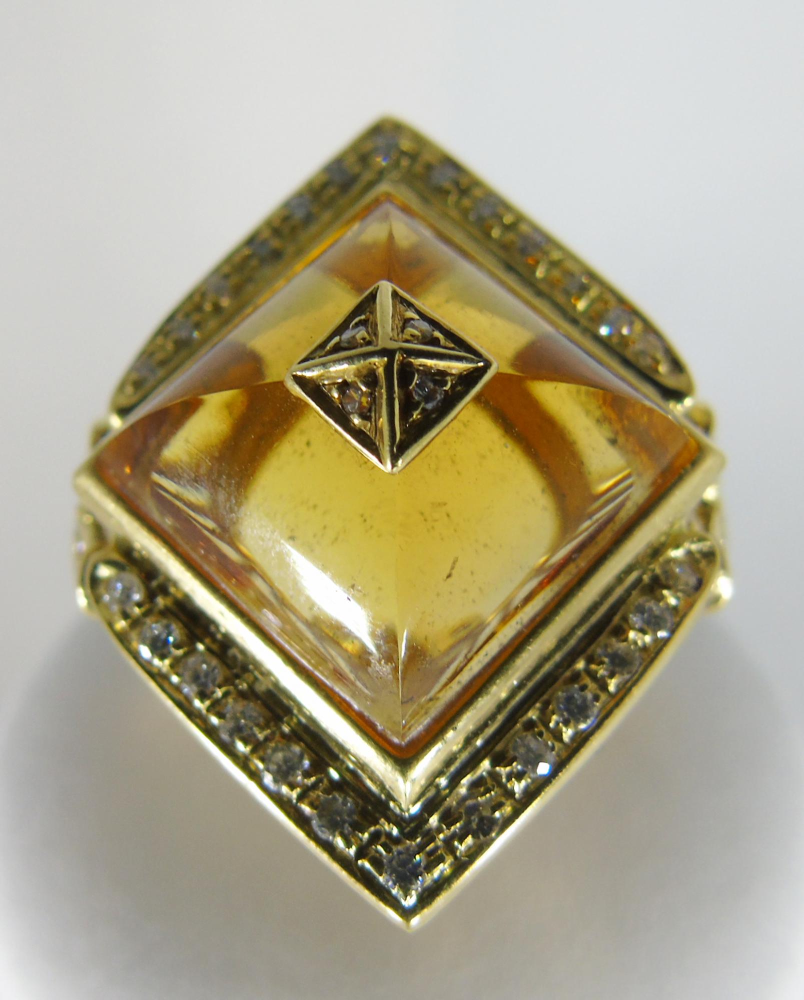 Anello in oro giallo 18kt, 12,50 gr., con al centro quarzo citrino e diamanti per ct. 0,32 circa.