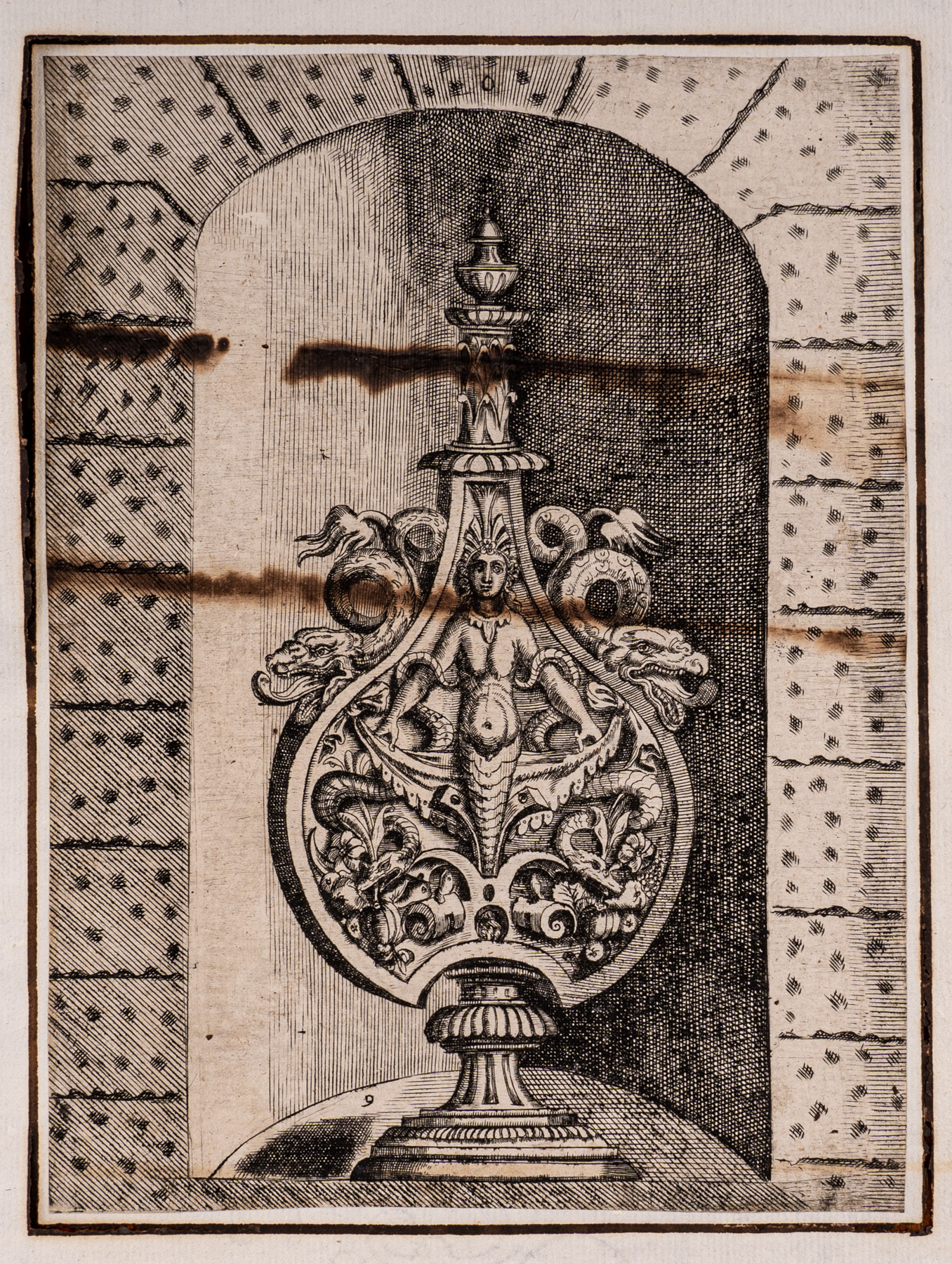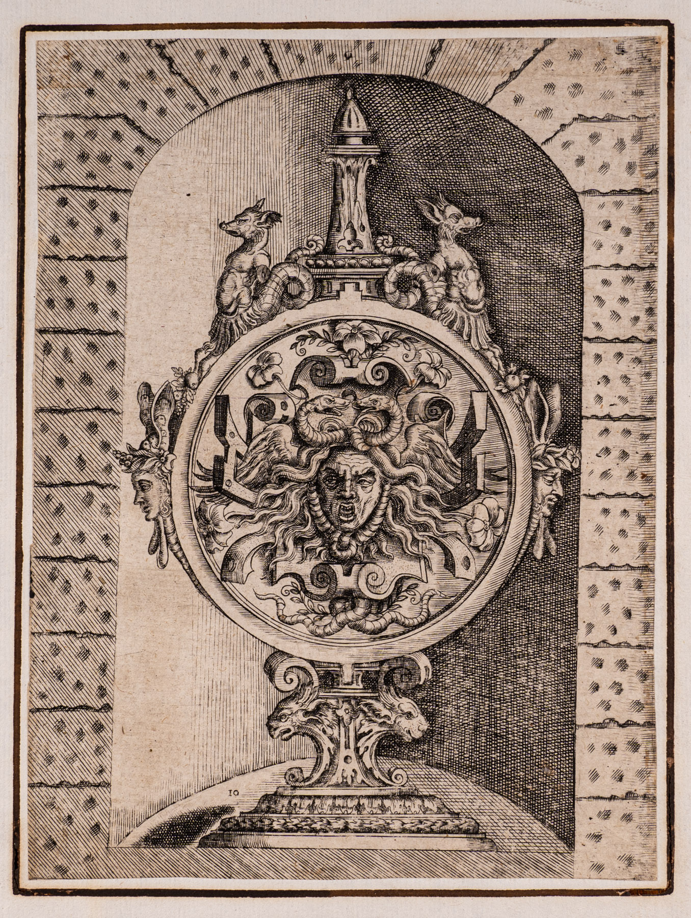 Serie di quattro incisioni con reliquiari decorati a grottesca