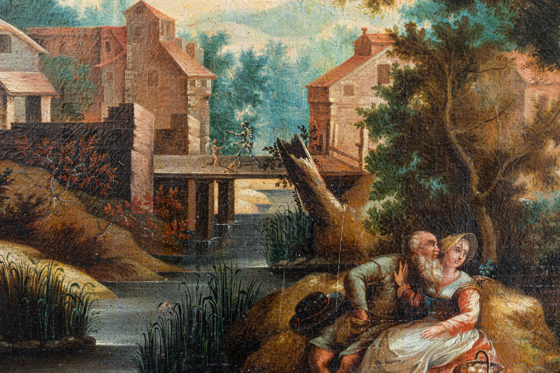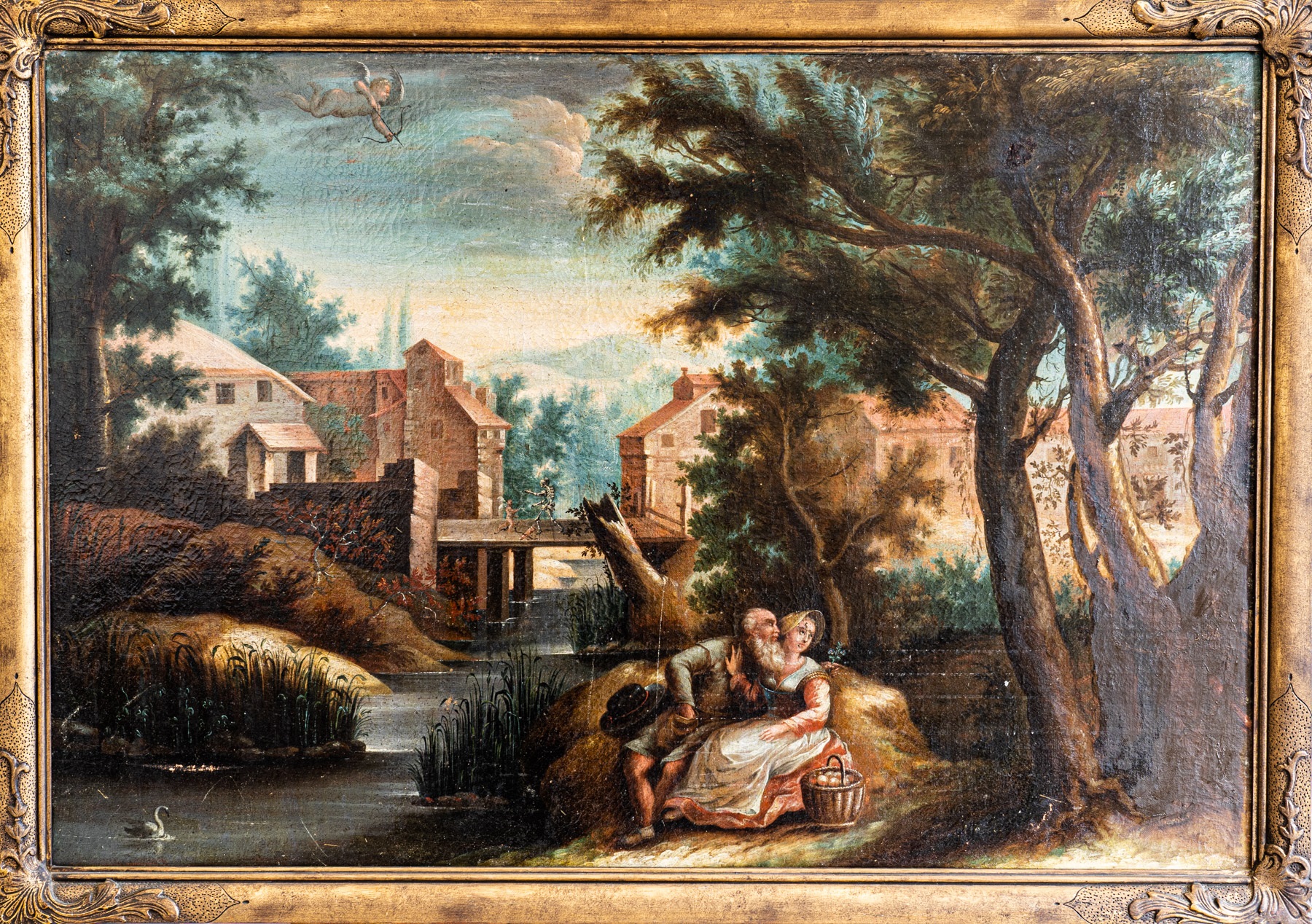 Il presente dipinto mostra la rara iconografia della lotta tra Cupido e la Morte, rappresentata sullo sfondo al centro della composizione.
