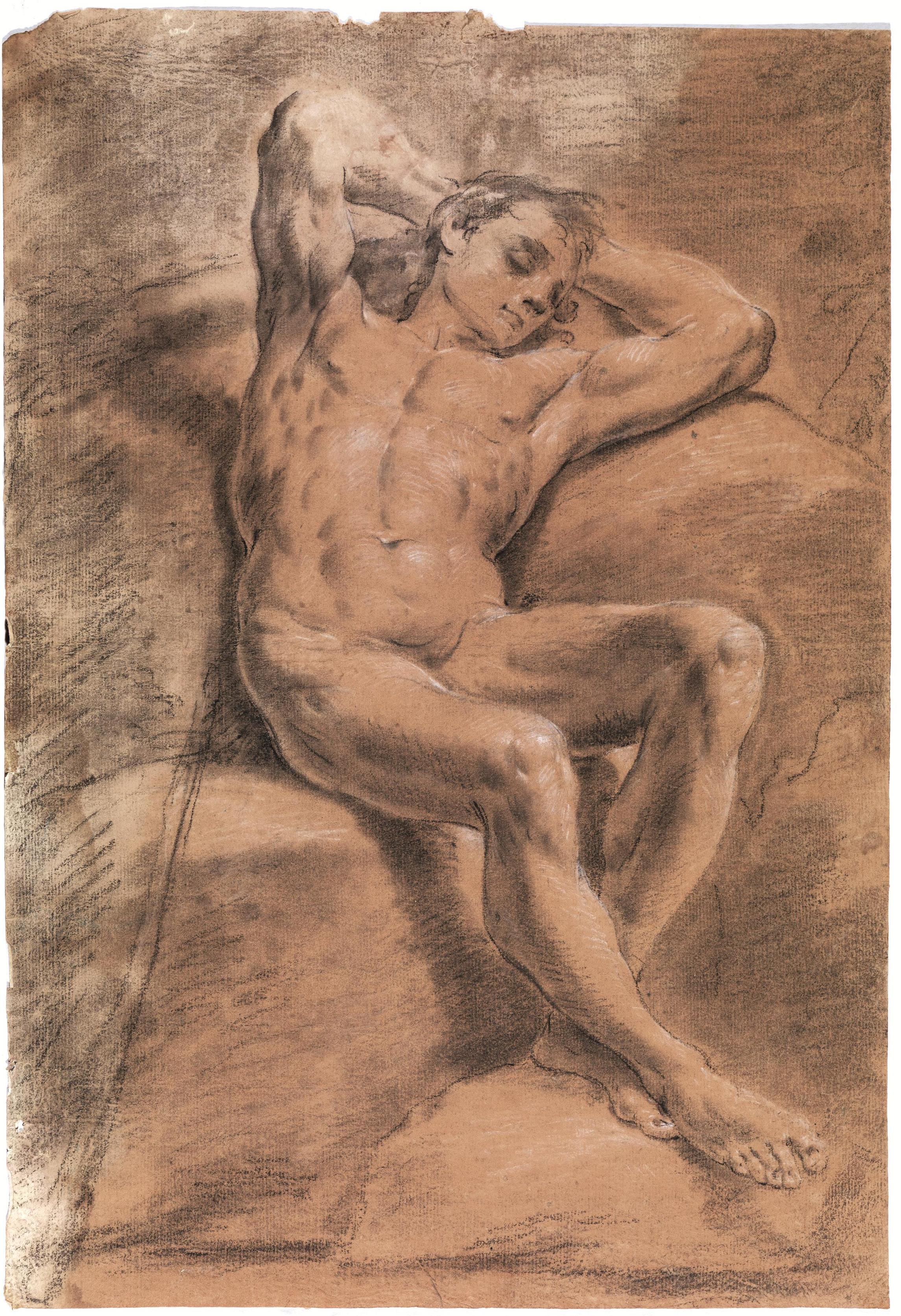 Gessetto nero con rialzi a matita bianca su carta vergellata preparata in color ocra con filigrana “Ancora in un cerchio singolo su lettere M(?) sormontato da croce”. mm 427x290.