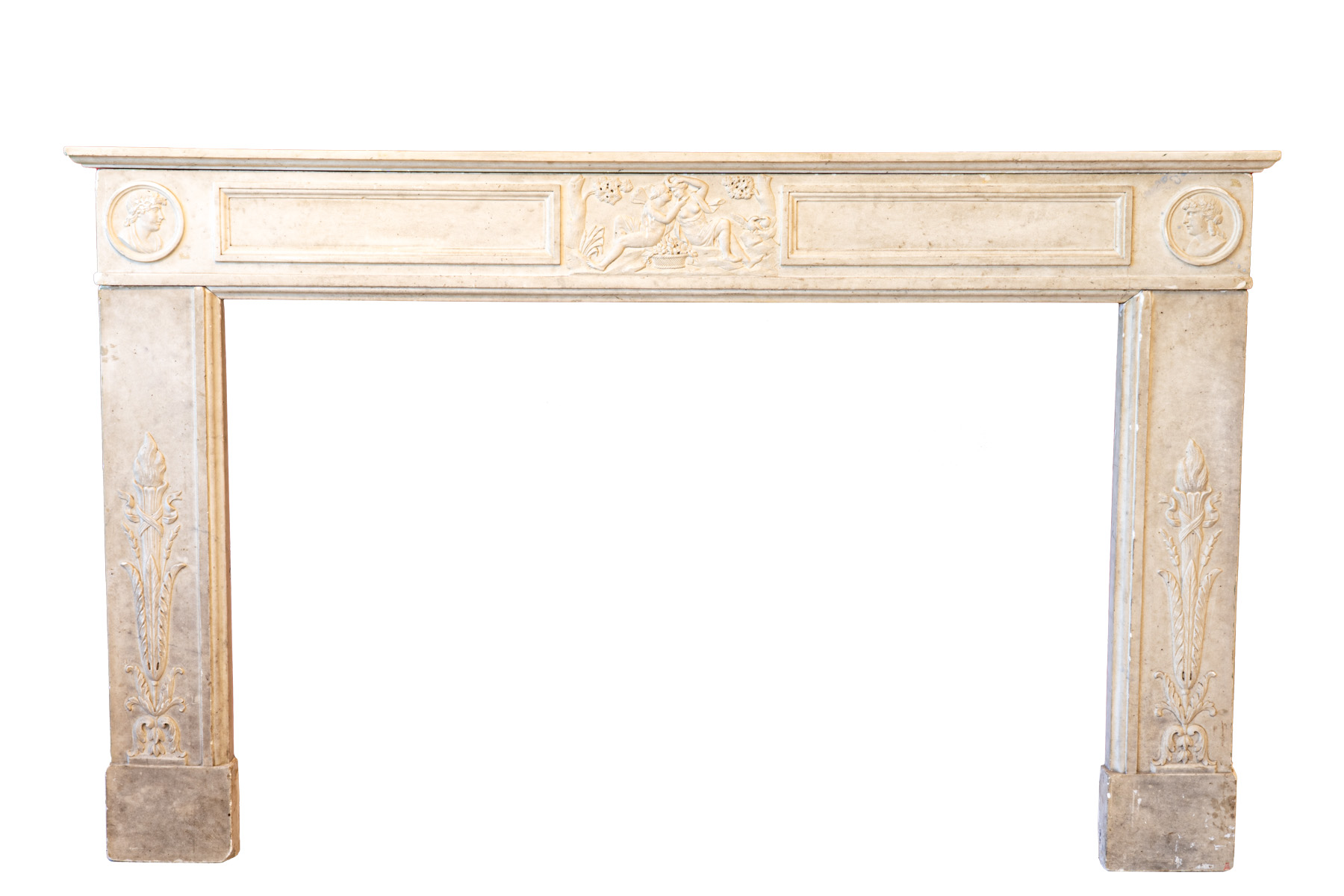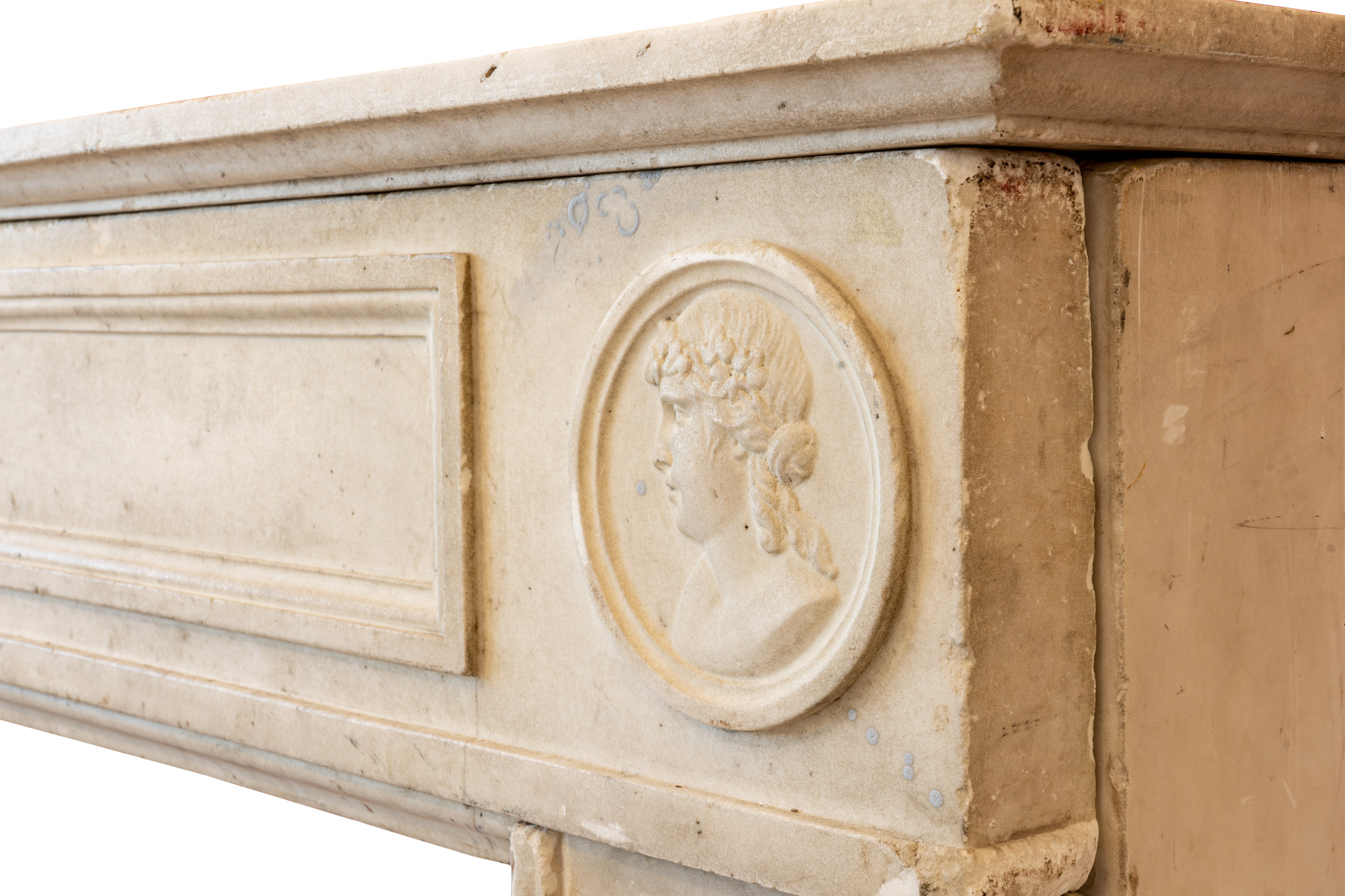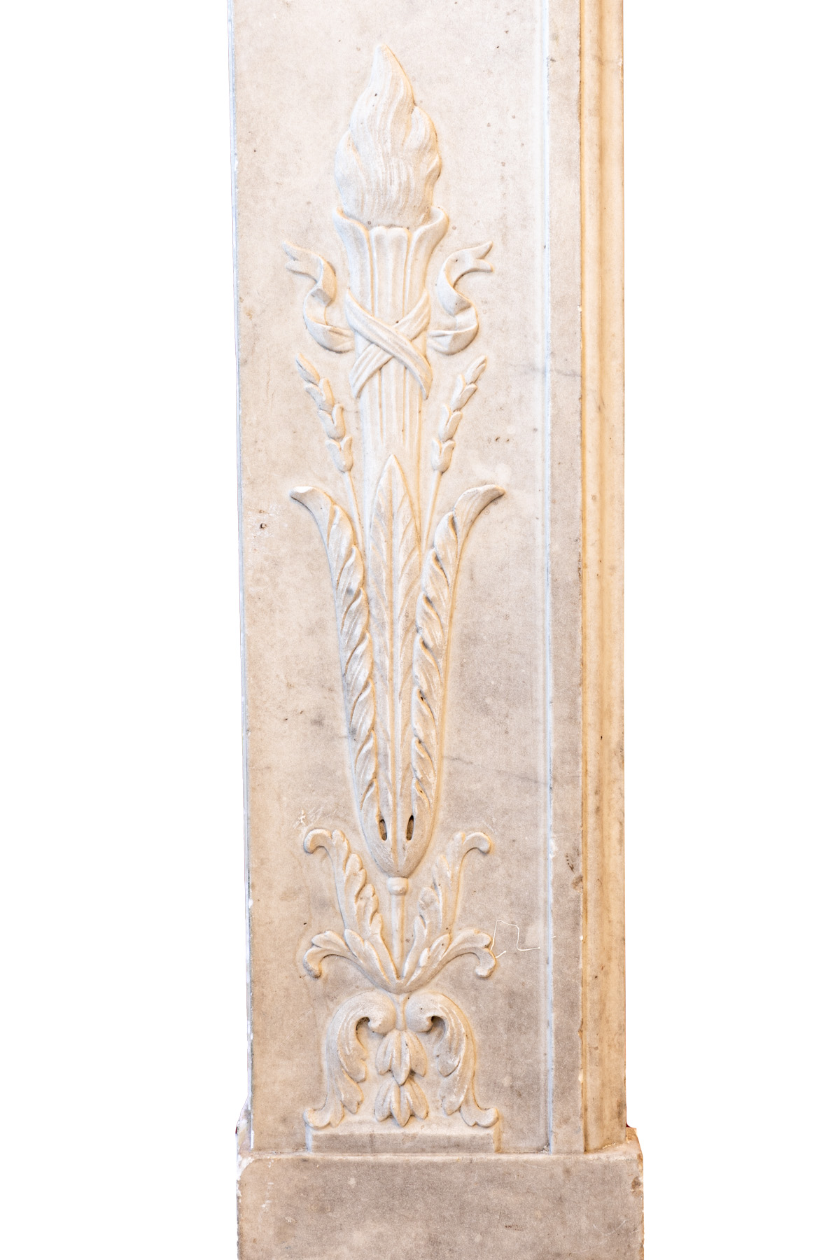 Camino neoclassico ultimo quarto XVIII secolo in marmo bianco scolpito, piano...