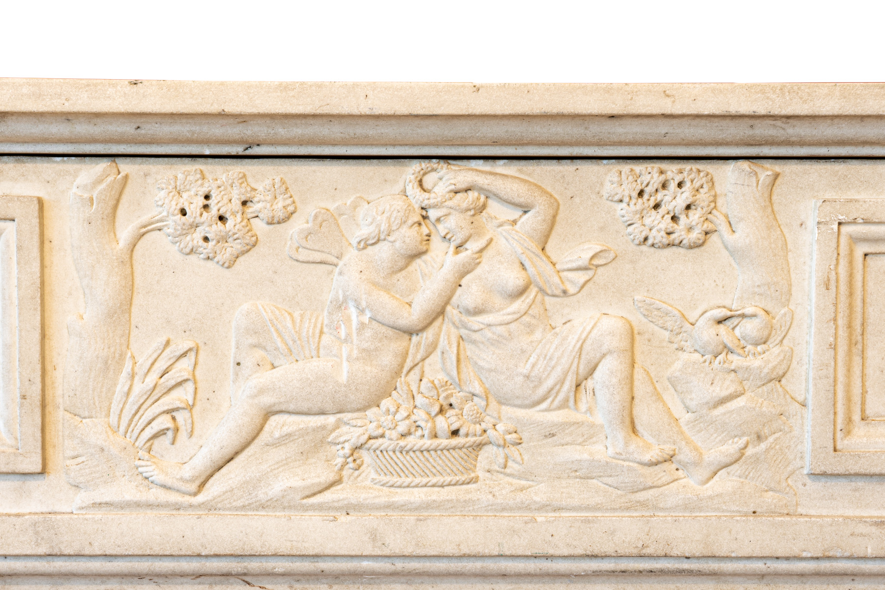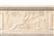 in marmo bianco scolpito, piano rettangolare con becco di civetta, fascia centrata da medaglione a bassorilievo col mito di Amore e Psiche, medaglioni con profili maschili ai lati, montanti scolpiti con faci accese fra foglie di acanto