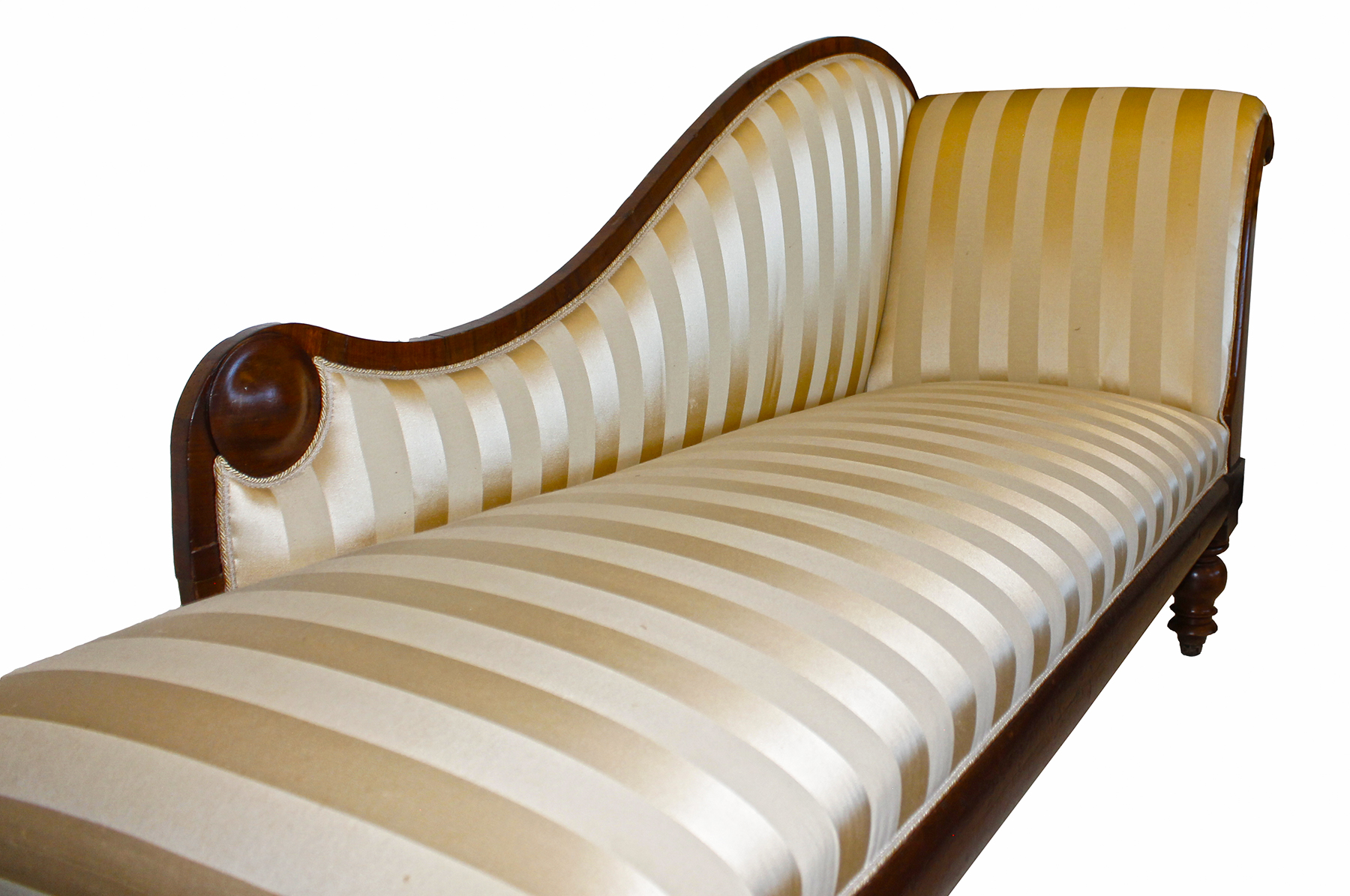 in noce, schienale di linea sagomata, ricoperta con tessuto a righe, gambe tornite a trottola.