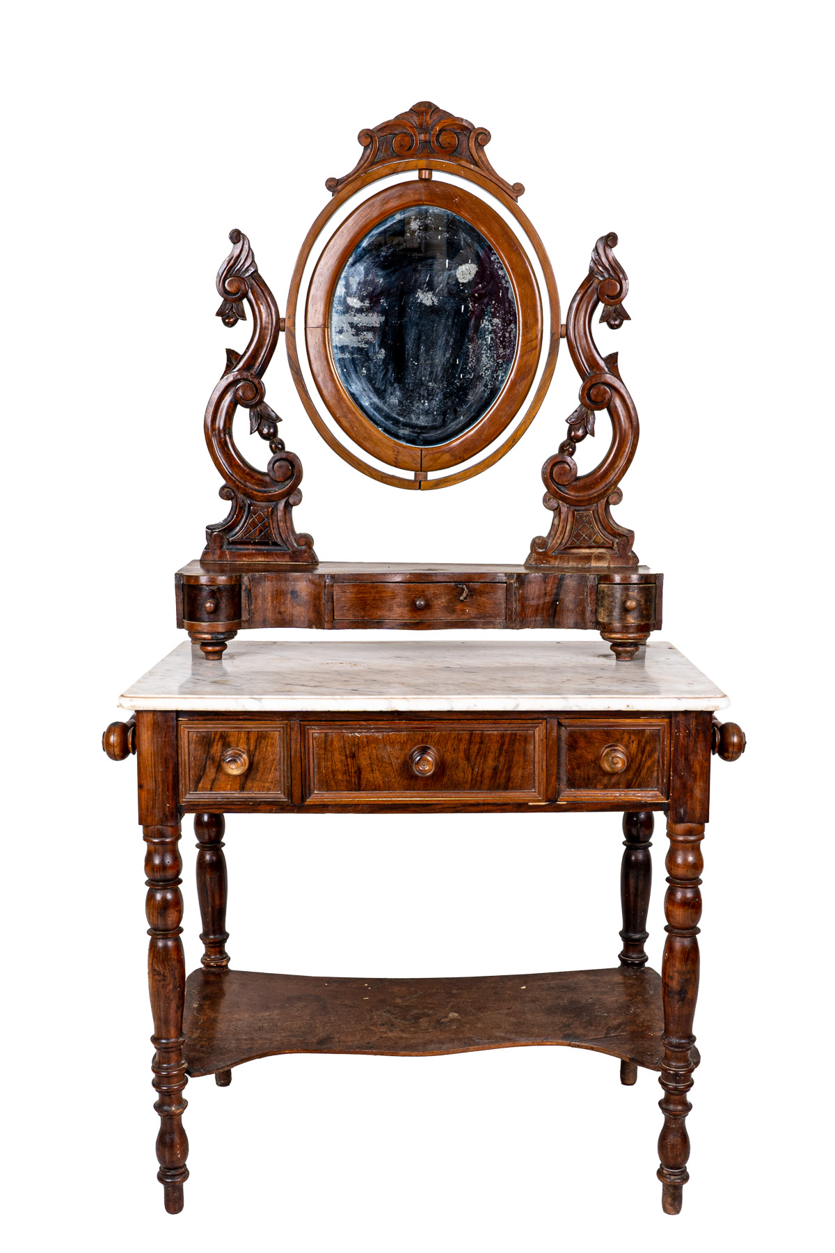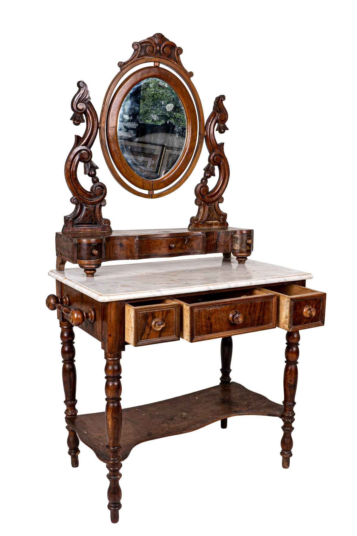 in noce, con soprastante specchiera a bilico fra sostegni a volute e tre cassettini nella base, piano in marmo bianco, tre cassetti frontali, portasciugamani laterali, sottopiano sagomato, gambe tornite