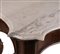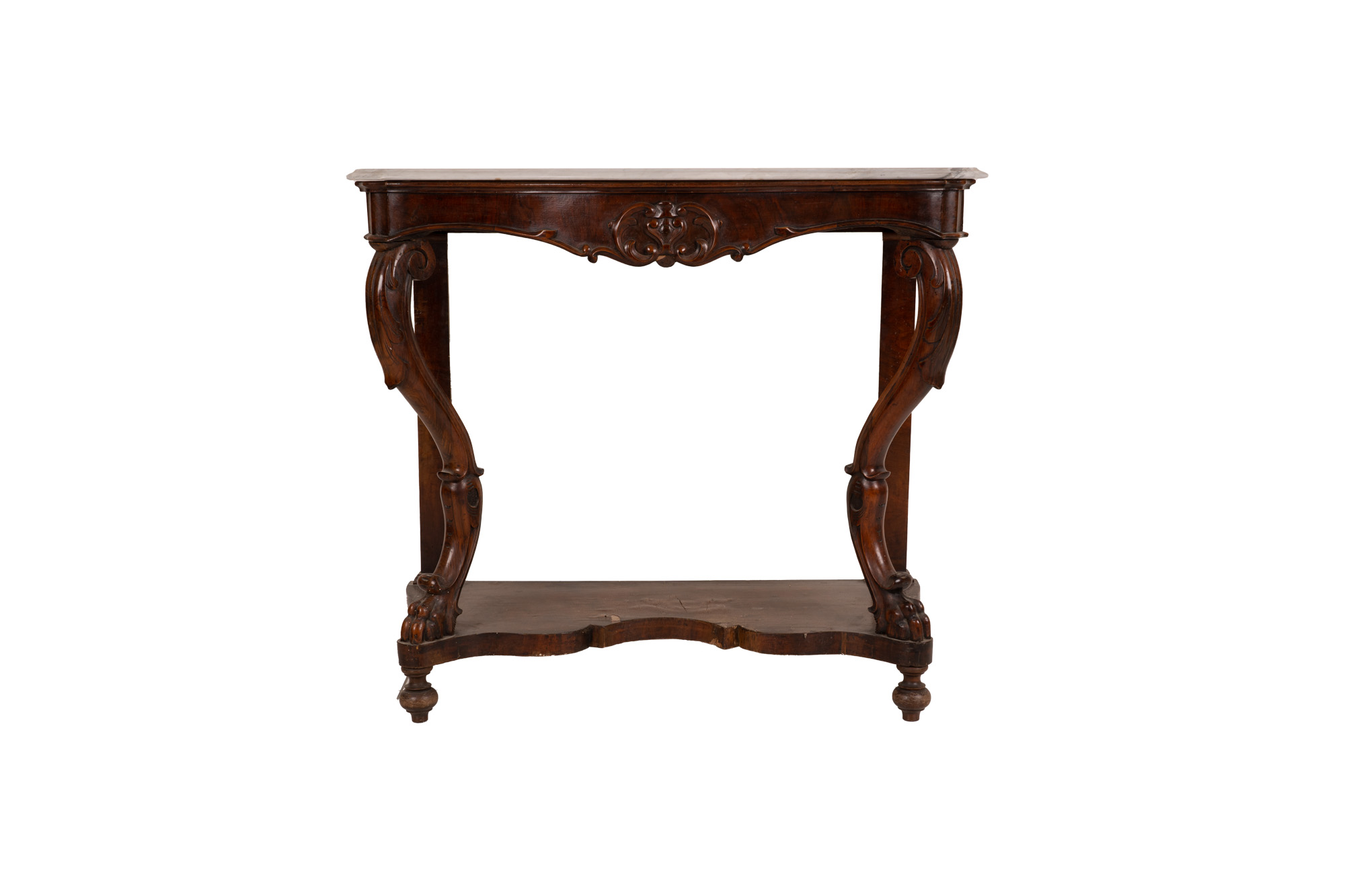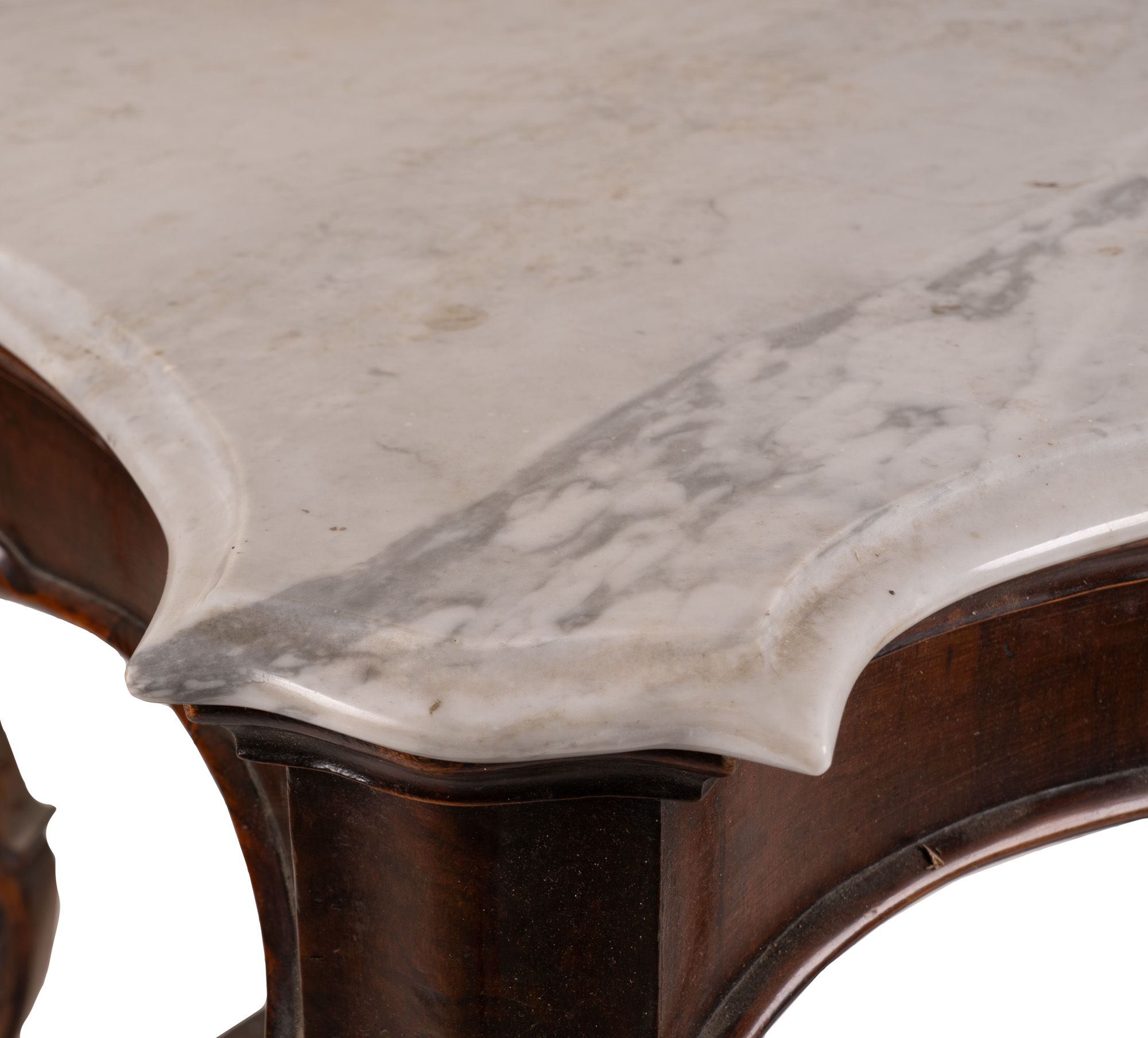 in noce intagliato, piano sagomato in marmo bianco, gambe a voluta, sottopiatto sagomato, piedi a trottola