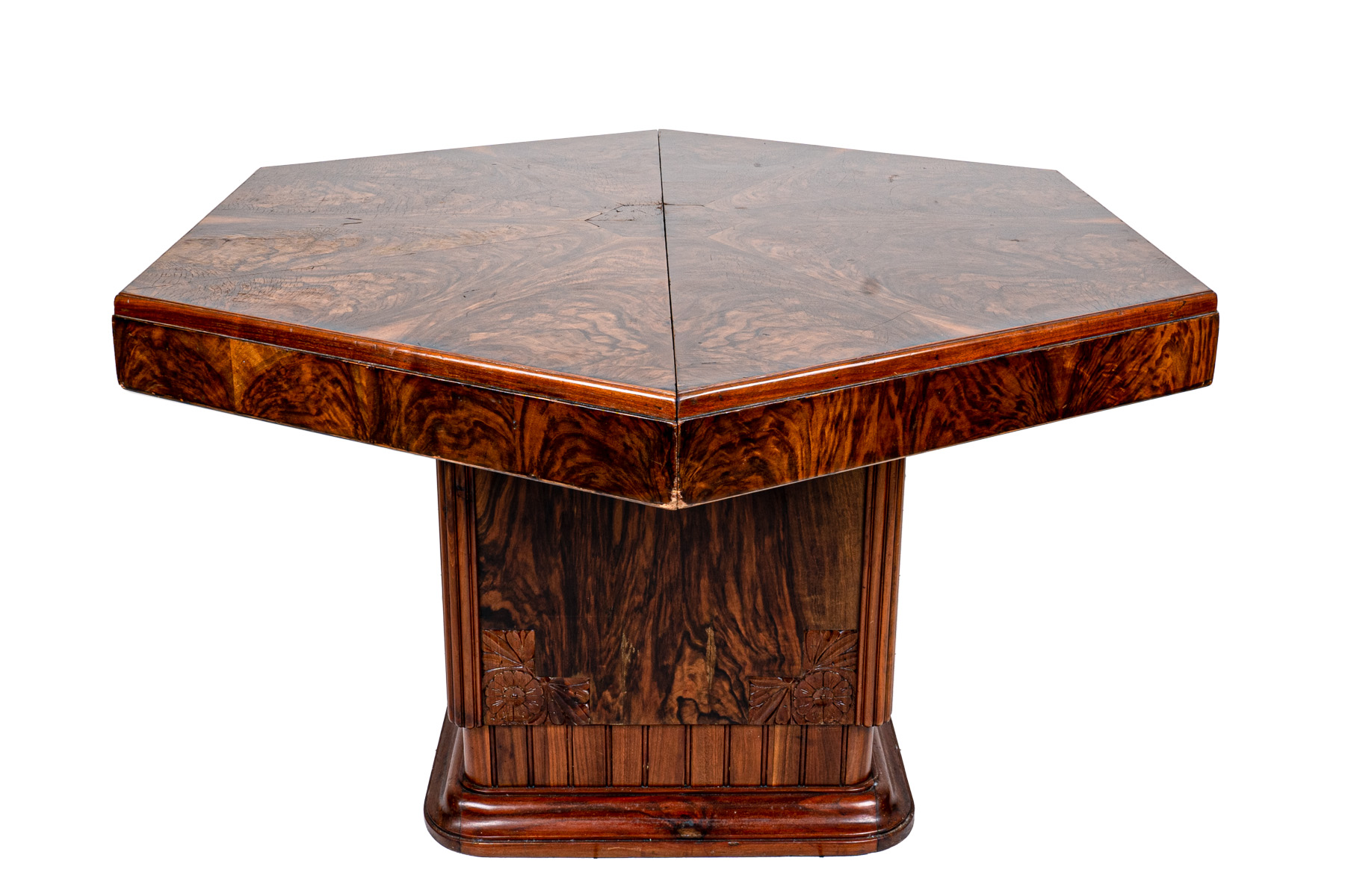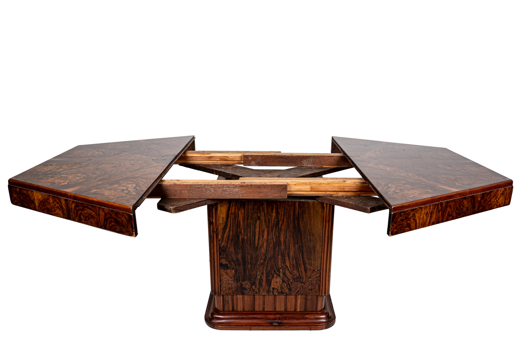 Tavolo Francia periodo Decò in radica di noce intagliata, piano apribile di...