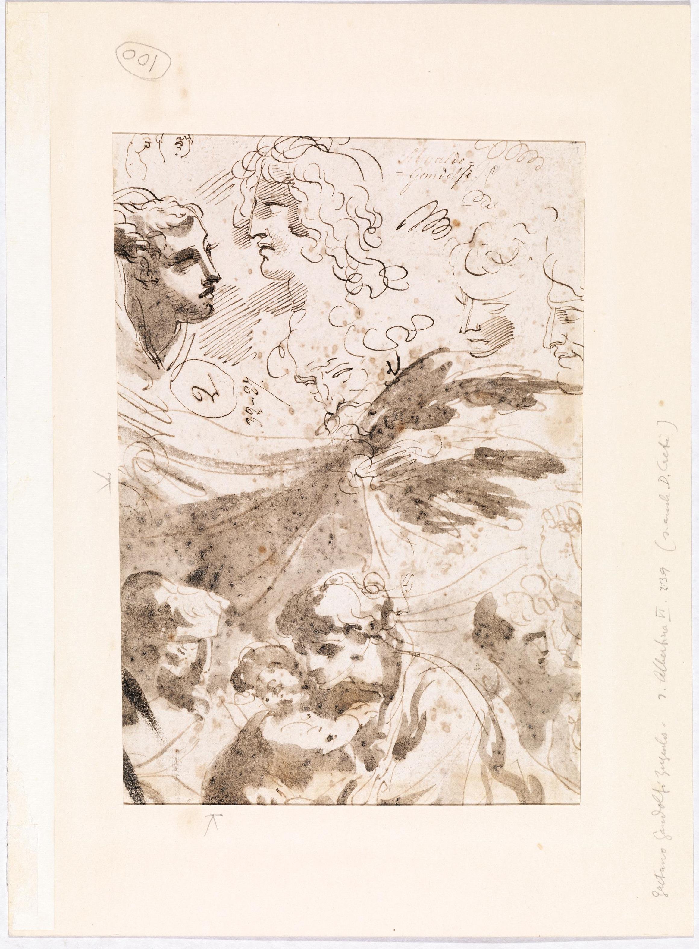 Al verso: Studi di volti e di Sacra famiglia. Penna e inchiostro bruno e acquerello grigio. Iscritto al verso “Ubaldo Gandolfi” e numerato “2” e “32-27” a penna.