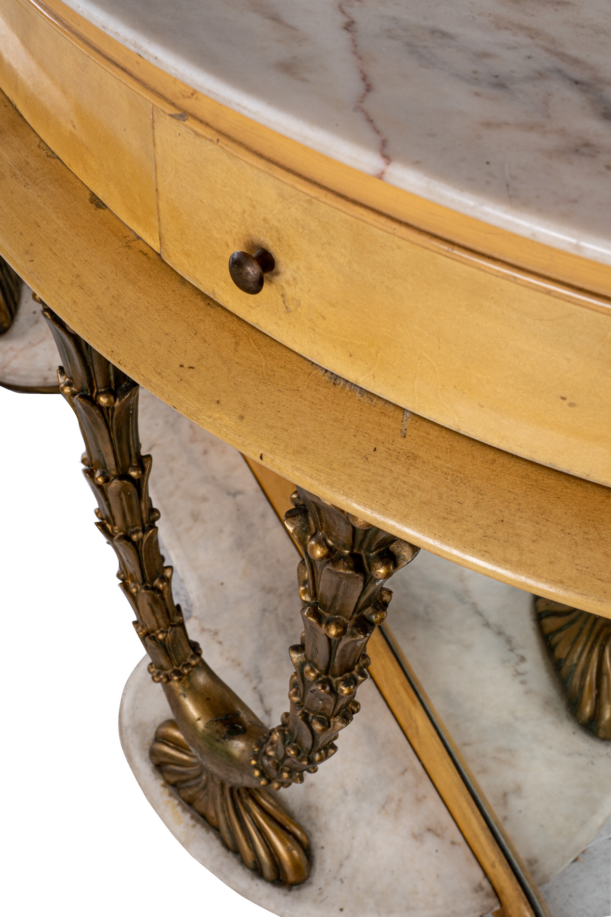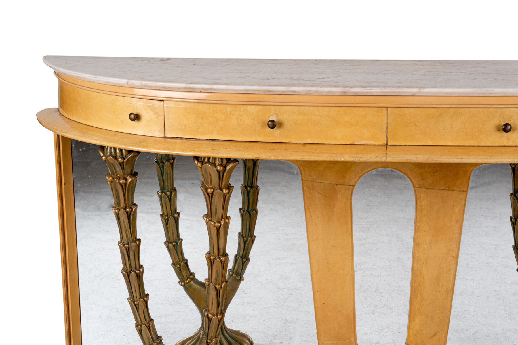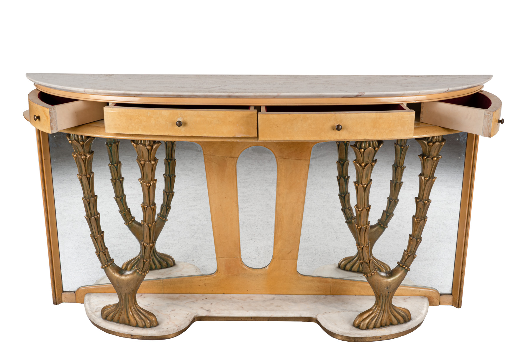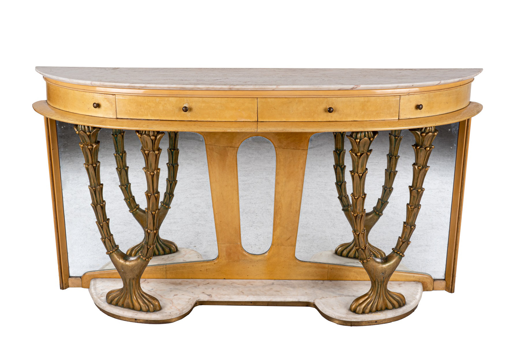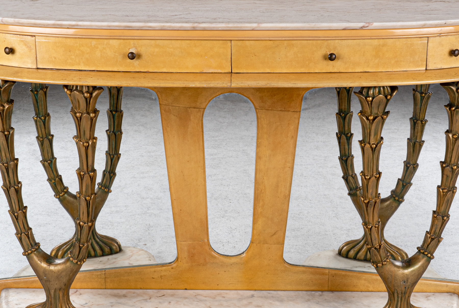 in legno ricoperto in pergamena, piano semilunato in breccia di marmo bianco, quattro cassetti nella fascia, sostegni anteriori intagliati e dorati in forma di arbusti vegetali, fondo a specchio, base sagomata in marmo