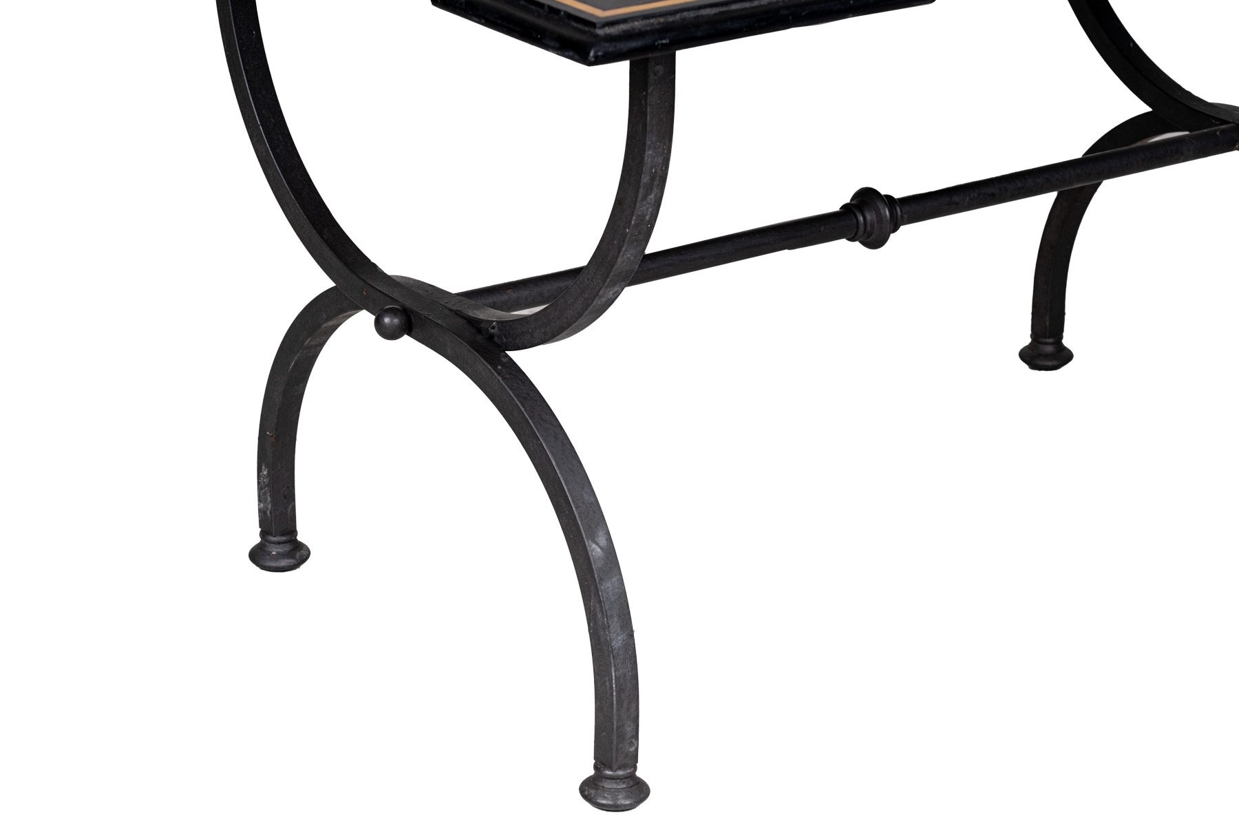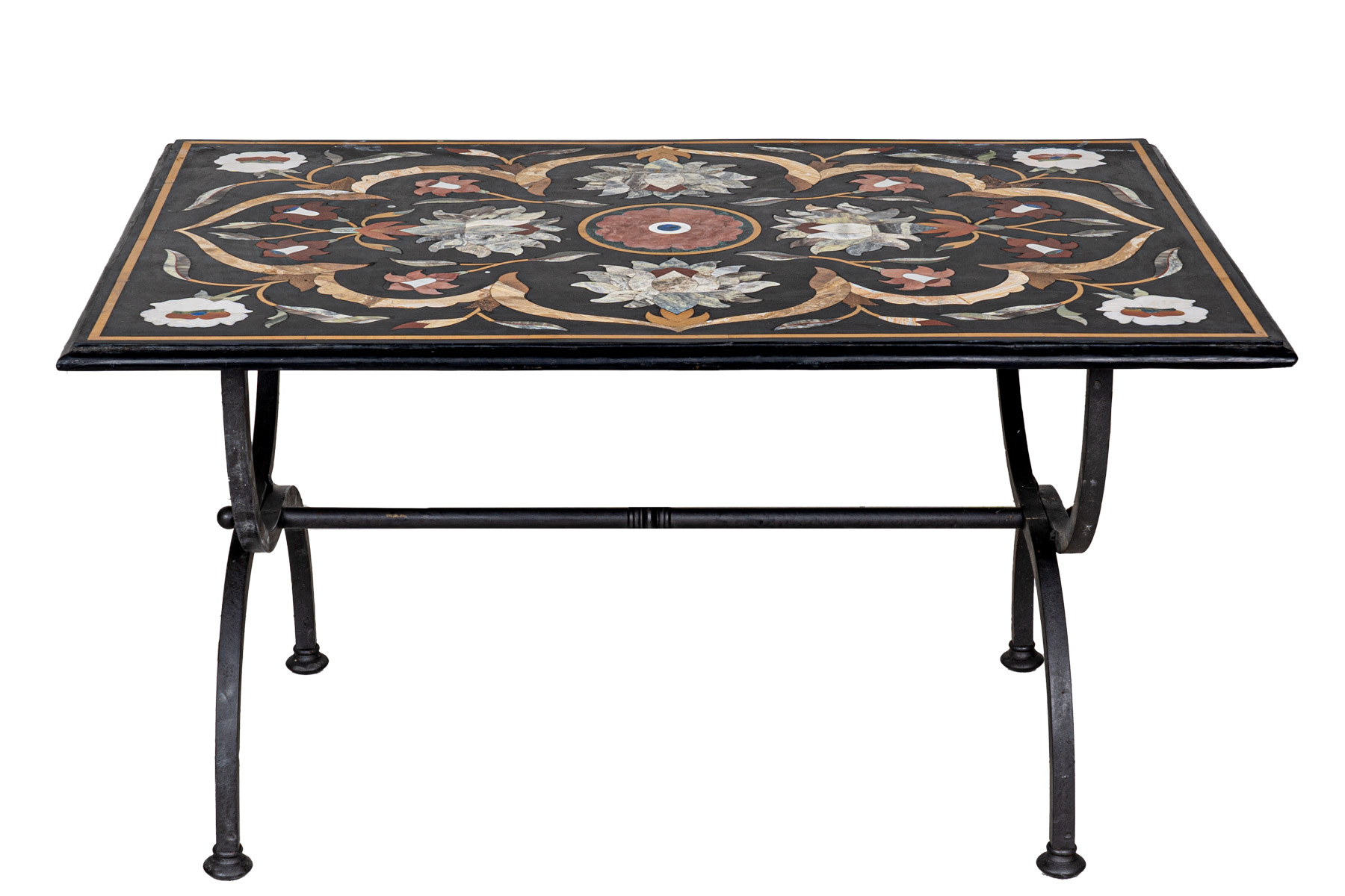 piano in marmo nero con intarsi in pietre dure semipreziose e basamento in ferro battuto