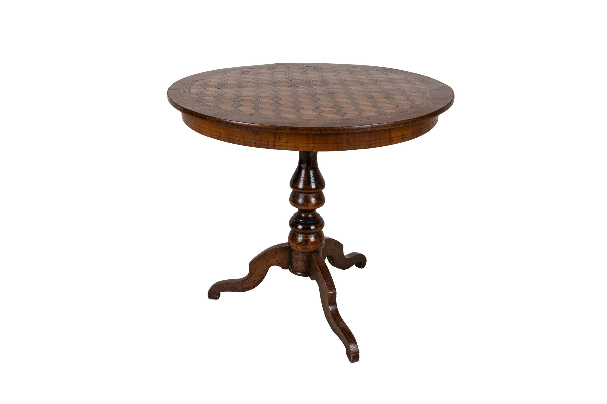 in noce ed altri legni, piano circolare intarsiato a scacchiera, fusto a balaustro tornito su tre gambe mosse