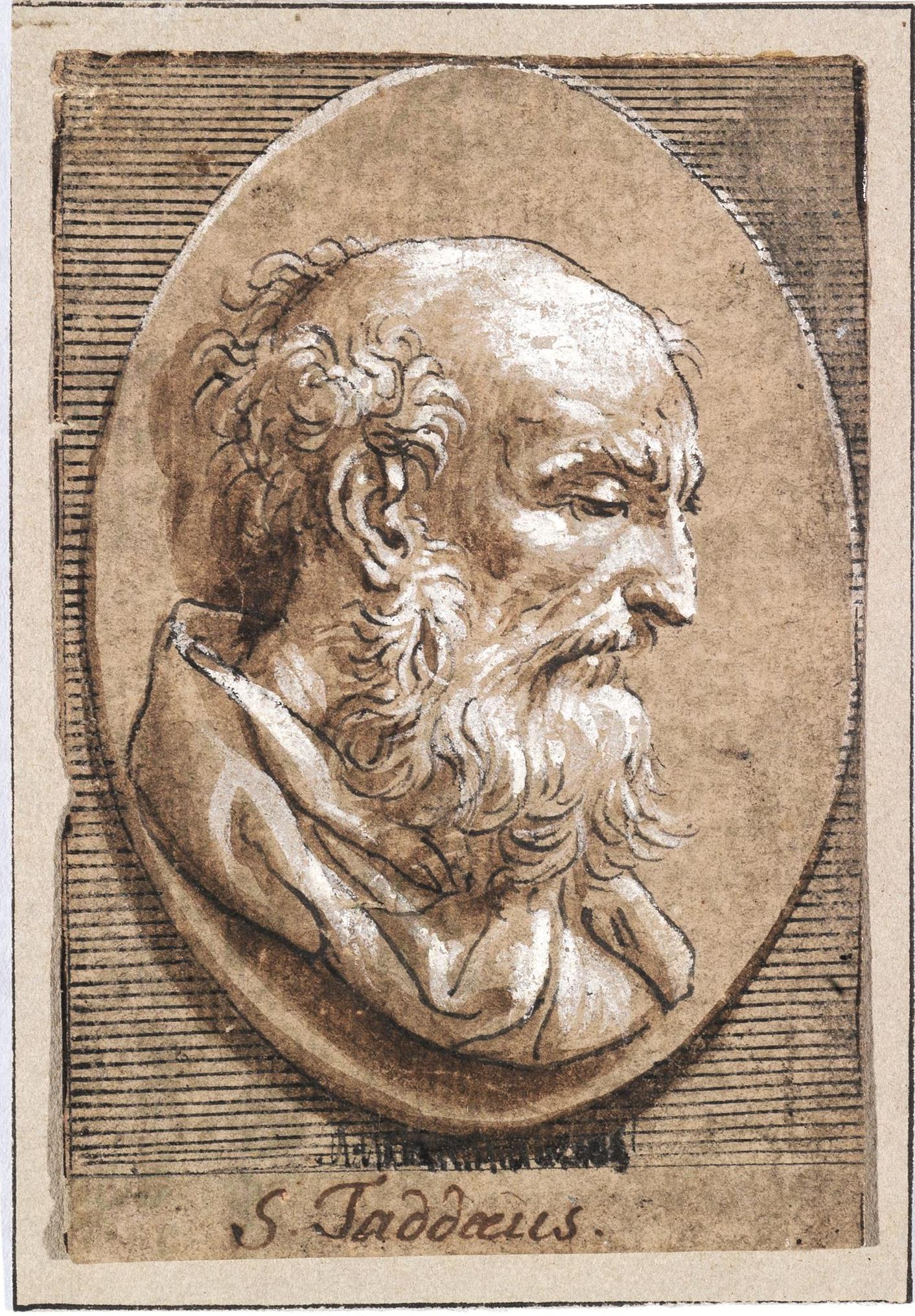 Penna e inchiostro nero, inchiostro bruno e rialzi a tempera bianca su carta vergellata. mm 103x69. Iscritto a penna “S.Taddeus” in basso.