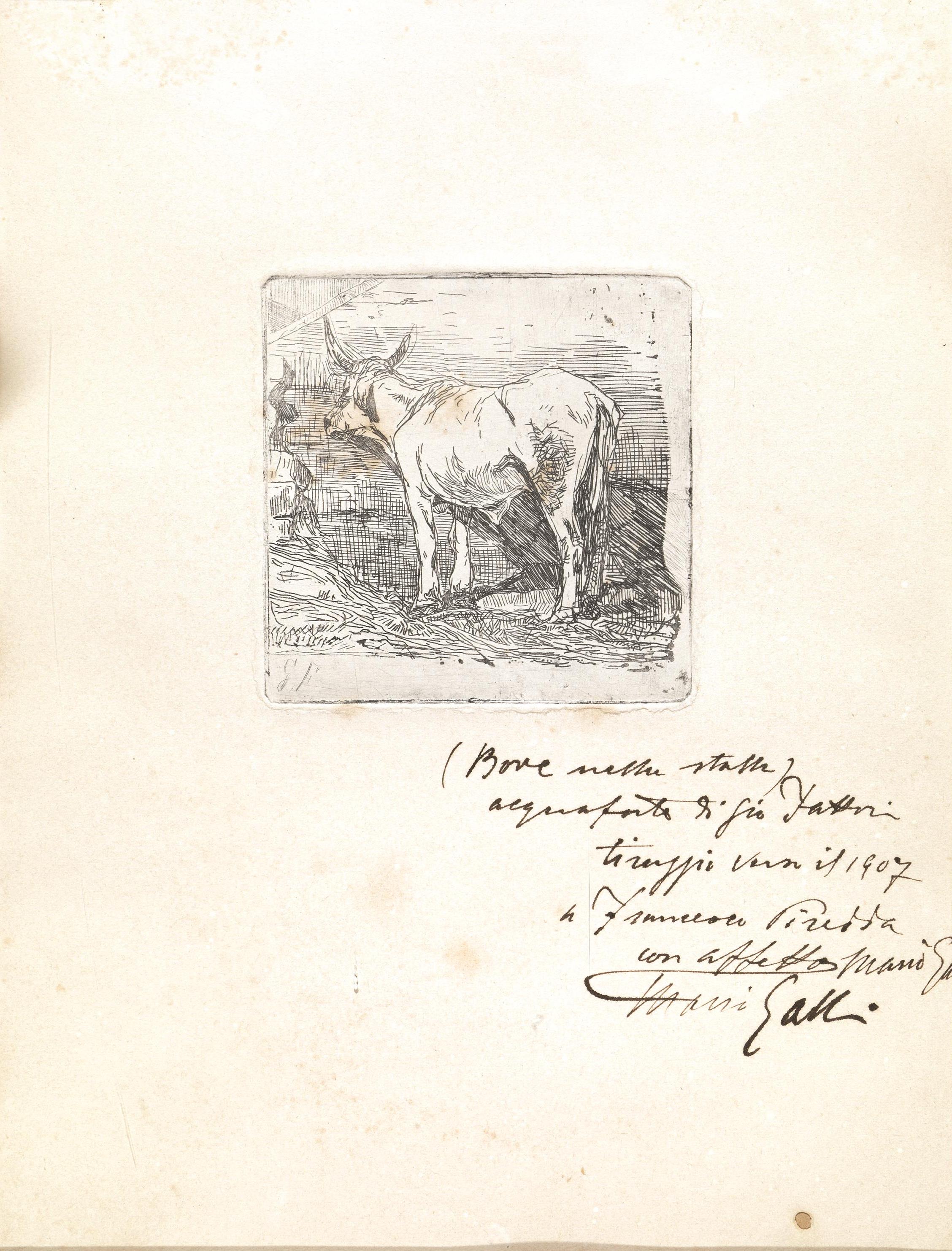 Rara incisione, fra le prime realizzate dall’artista livornese. Firmata sulla lastra in basso a sinistra. Al recto dedica a penna “(Bove nella stalla)/acquaforte di Gio Fattori/tiraggi verso il 1907/a Francesco Piredda/con affetto Mario Galli”. Stato unico. Lastra conservata presso il Gabinetto Disegni e Stampe degli Uffizi (Inv 12M).