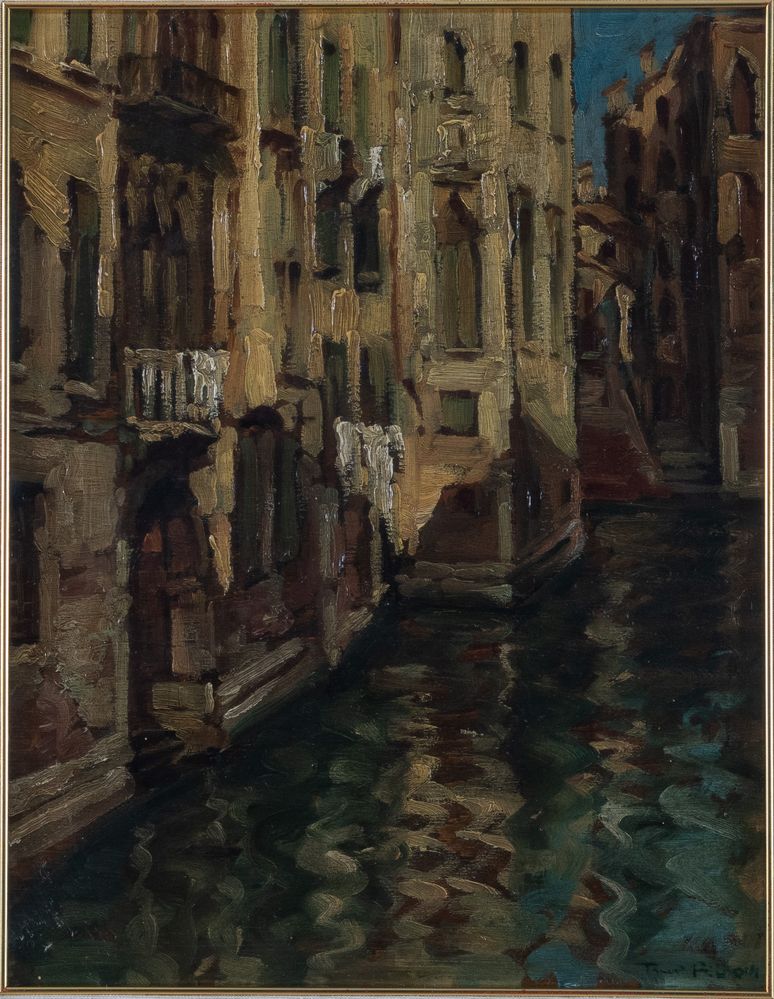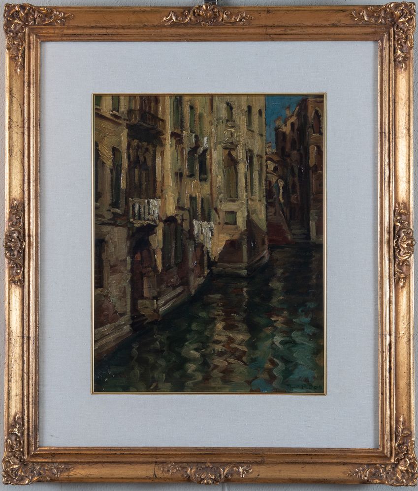 TINO PELLONI (Modena 1895-1981) “Scorcio di canale”. Olio su tela applicata su tavola. Cm 45,5x36. Opera firmata in basso a destra Tino Pelloni.