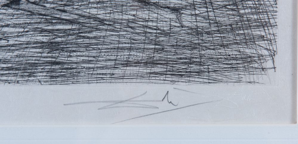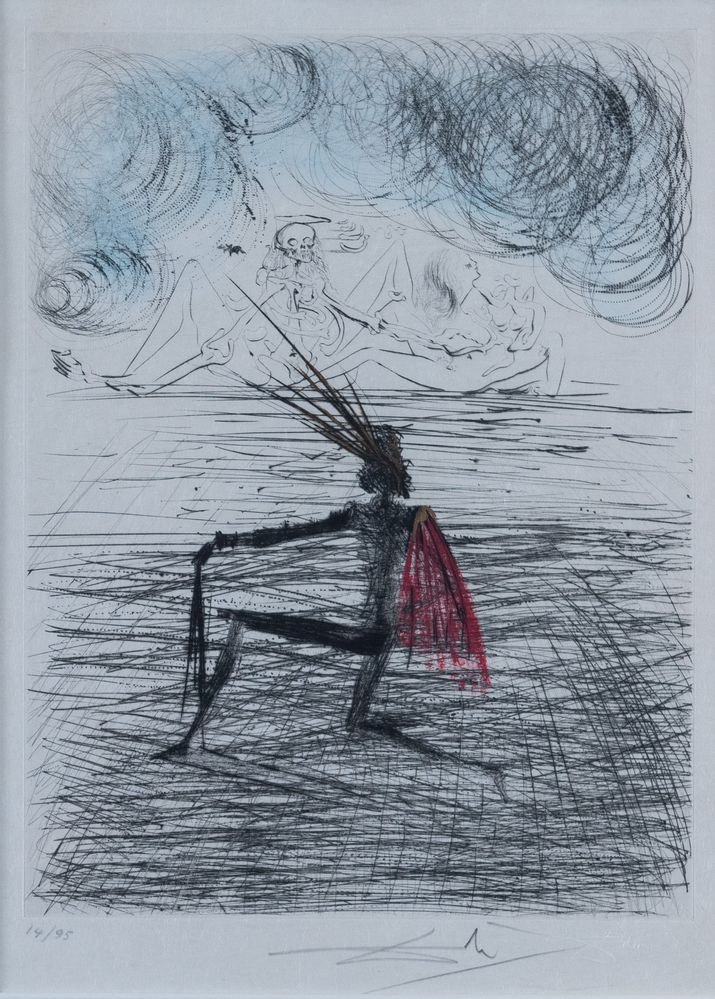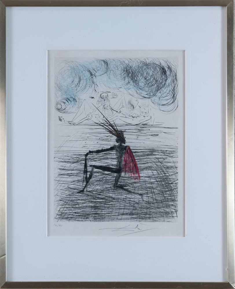 SALVADOR DALI' (Figueres, 1904 - 1989) "Faust", 1969. Acquaforte e acquatinta a colori su carta. Lastra: cm 32x24. Opera firmata e timbrata a secco in basso a destra Dalì. Reca numero di tiratura in basso a sinistra 14/95. Al retro reca timbro di Galleria d’arte Il Collezionista, Bologna.