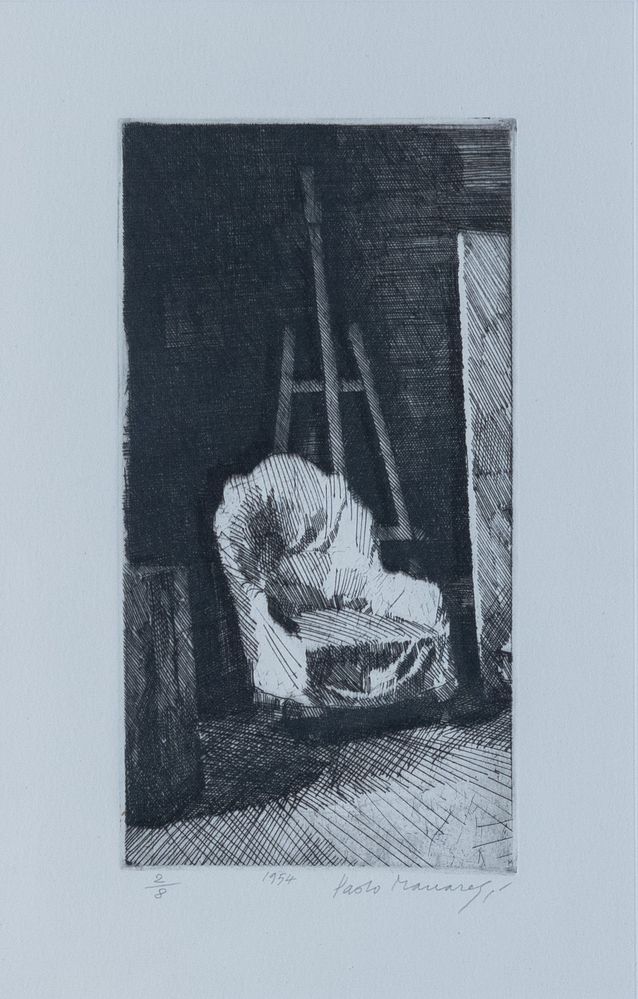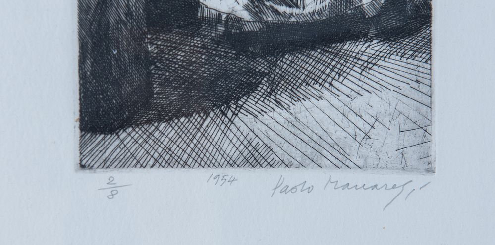 PAOLO MANARESI (Bologna 1908 - 1991) "Interno", 1954. Incisione su carta. Cm 28x18. Reca numero di tiratura, data e firma in basso 2/8 1954 Paolo Manaresi.