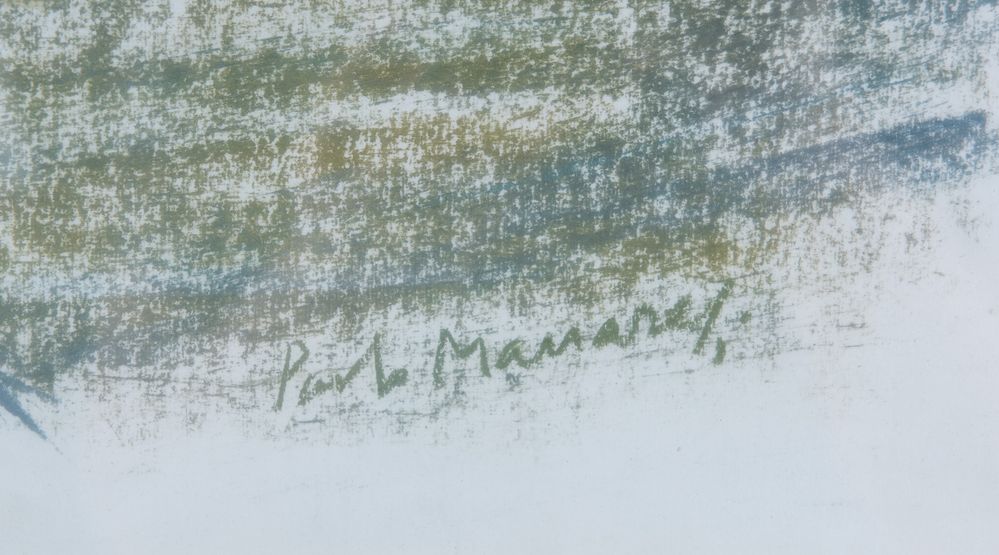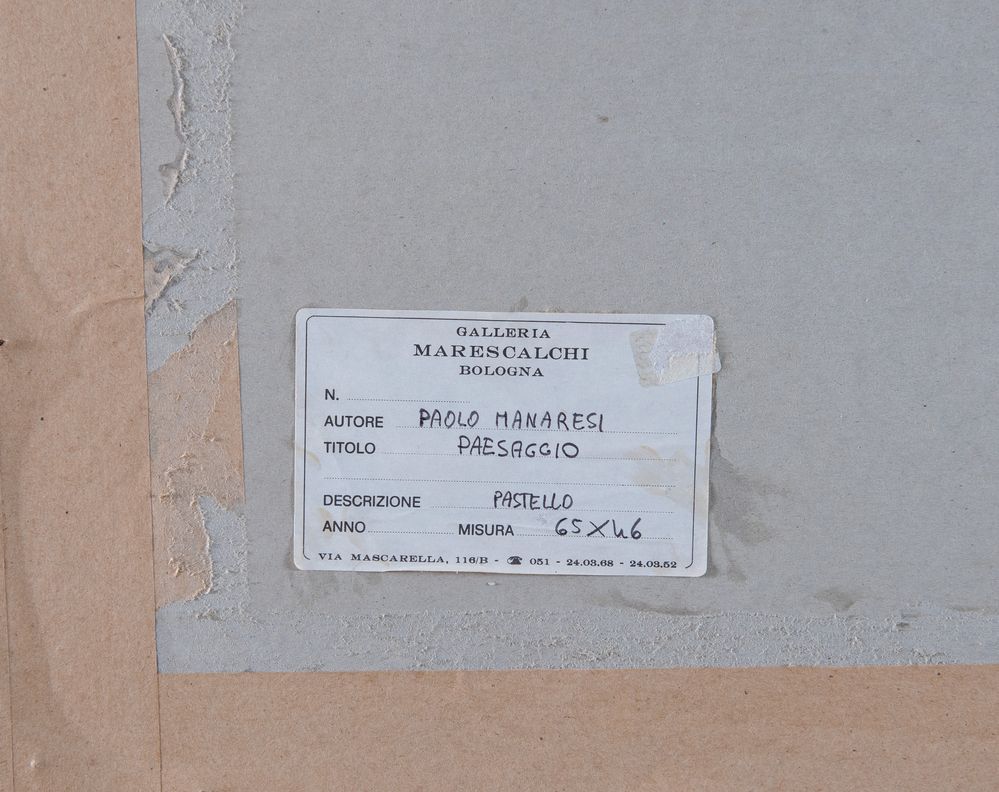 PAOLO MANARESI (Bologna 1908 - 1991) "Paesaggio". Pastello su carta. Cm 45x65. Opera firmata in basso a destra Paolo Manaresi. Al retro reca etichetta Galleria Maniscalchi, Bologna.