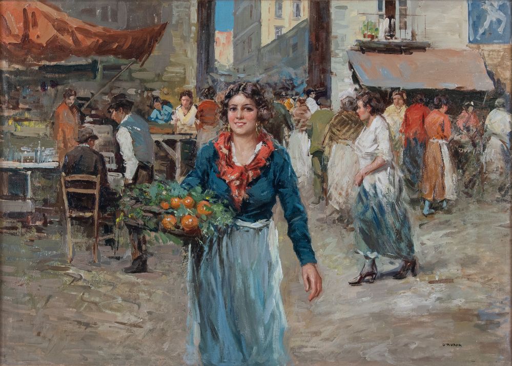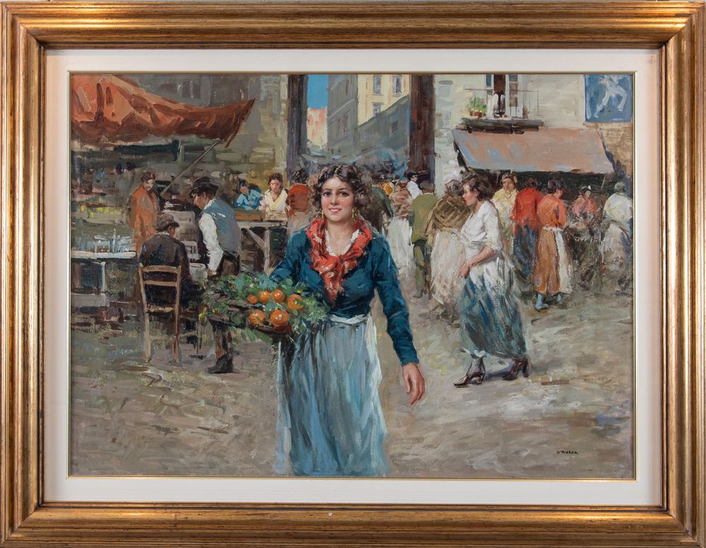 VINCENZO D’AURIA (1872-1939) “Scena di mercato”. Olio su tela. Cm 60,5x84,5. Opera firmata in basso a destra D'Auria.