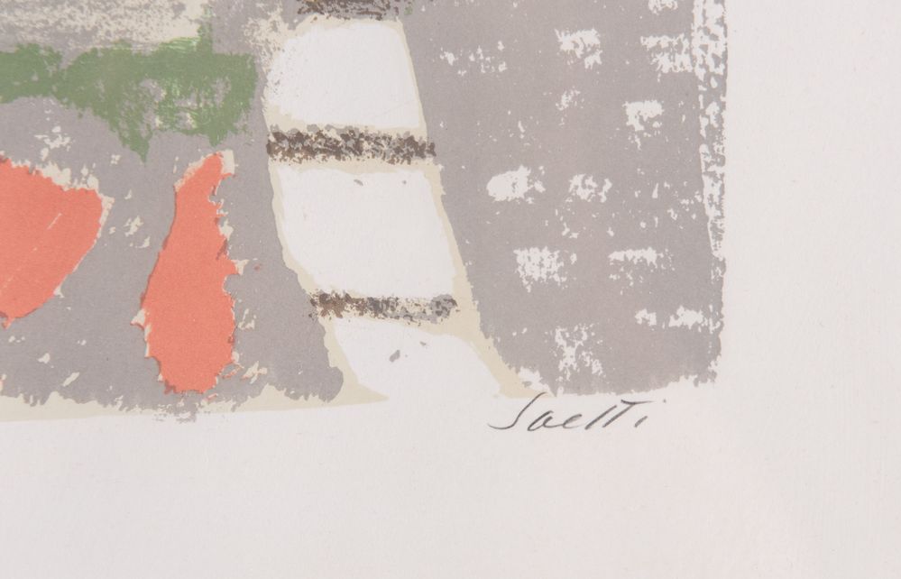 BRUNO SAETTI (Bologna 1902 - 1984) "Senza titolo". Litografia a colori su carta. Lastra: cm 38x49. Opera firmata in basso a destra Saetti. Reca numeri di tiratura in basso a sinistra 66/148.