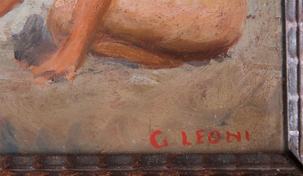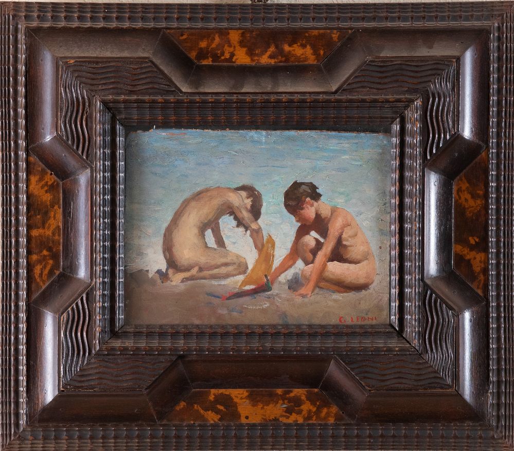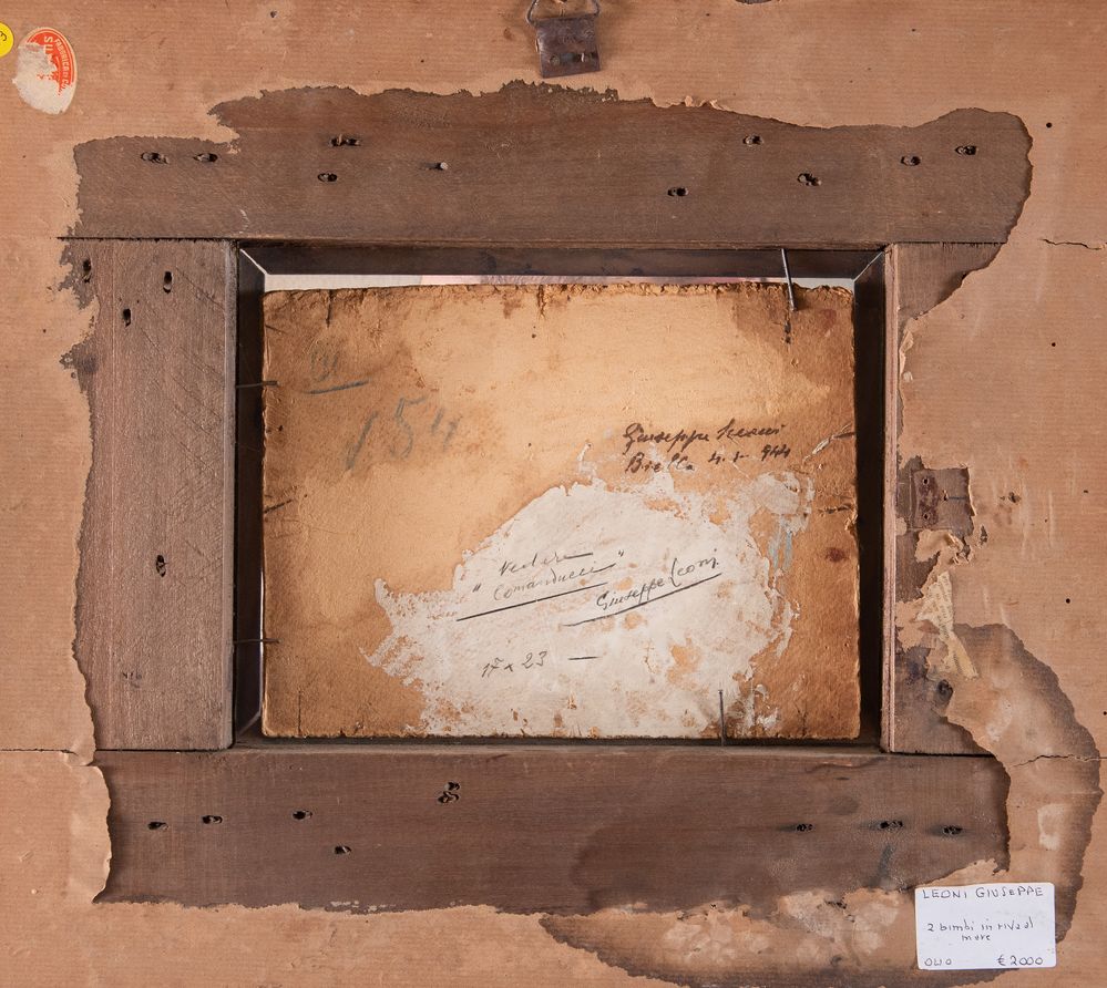 GIUSEPPE LEONI (Catania 1876 - 1927) "Fanciulli", 1944. Olio su faesite. Cm 17,5x23. Opera firmata in basso a destra G. Leoni. Al retro opera firmata e datata Giuseppe Leoni 944.
