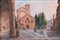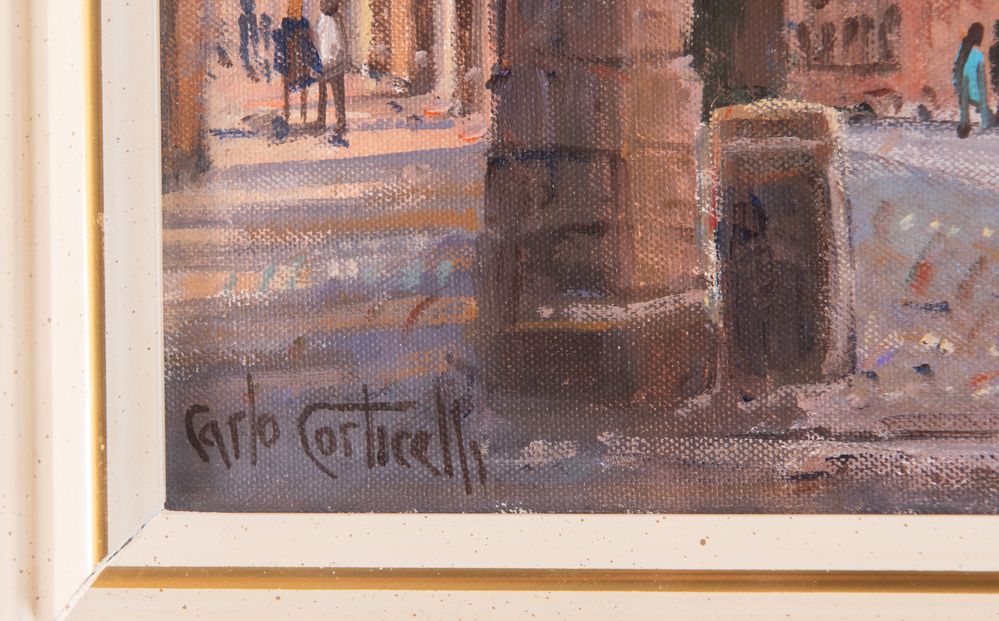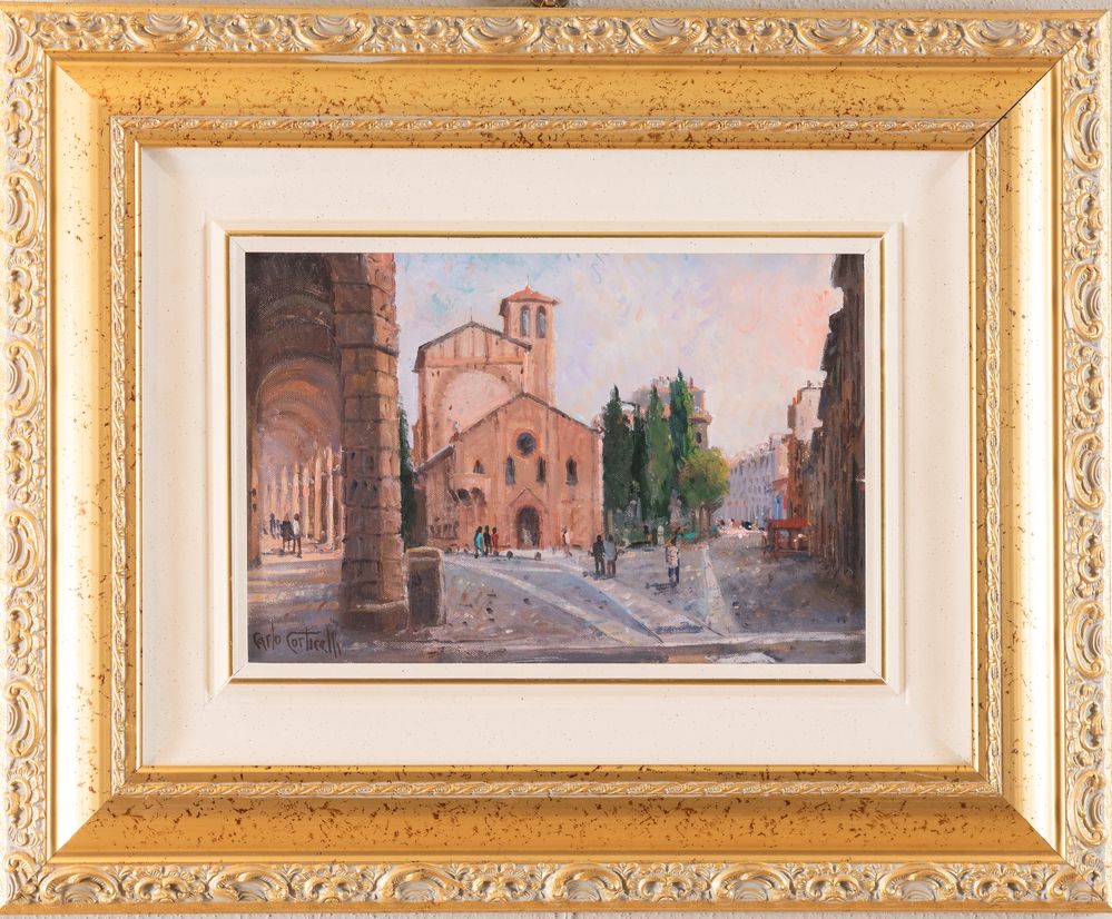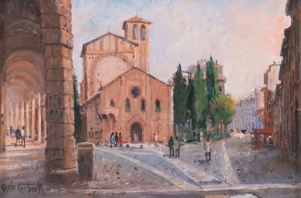 CARLO CORTICELLI (XX secolo) "Piazza Santo Stefano", 1999. Olio su cartone telato. Cm 20x30. Opera firmata in basso a sinistra Carlo Corticelli.
