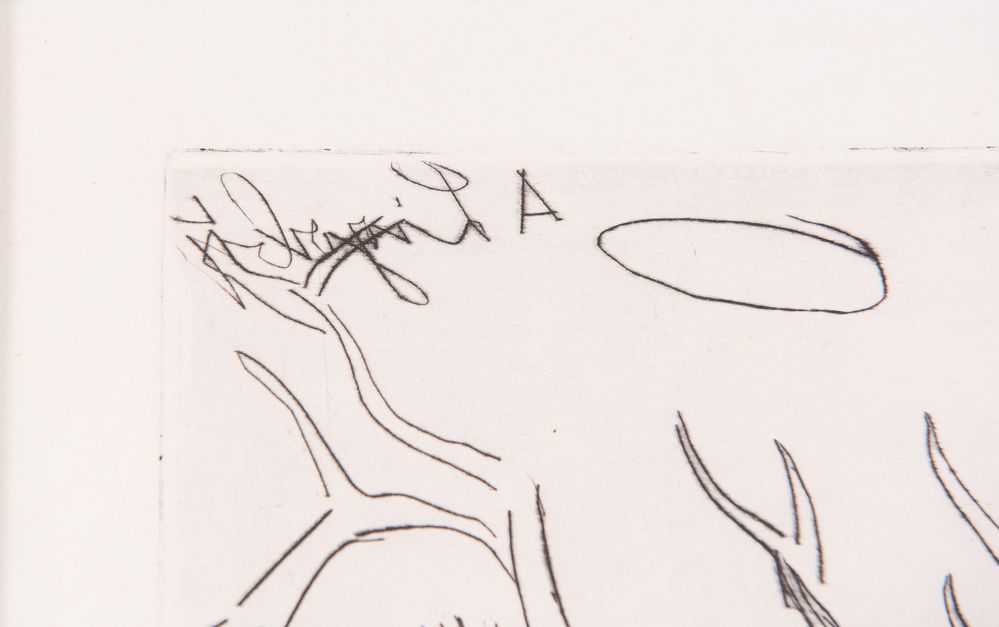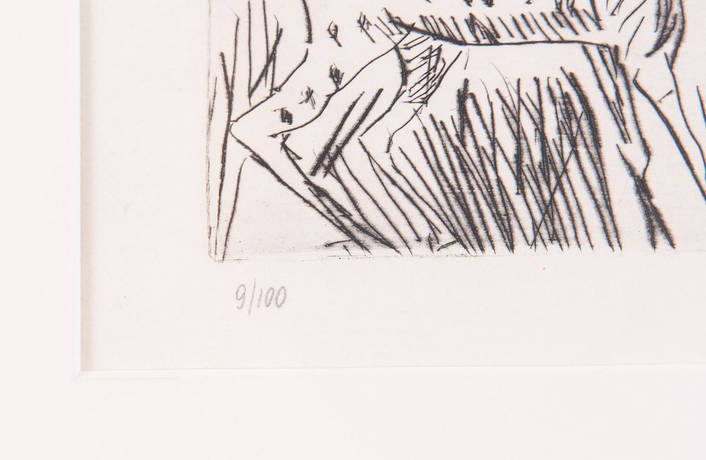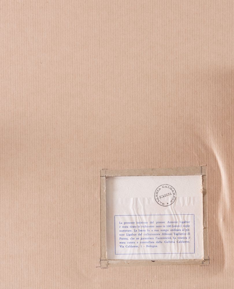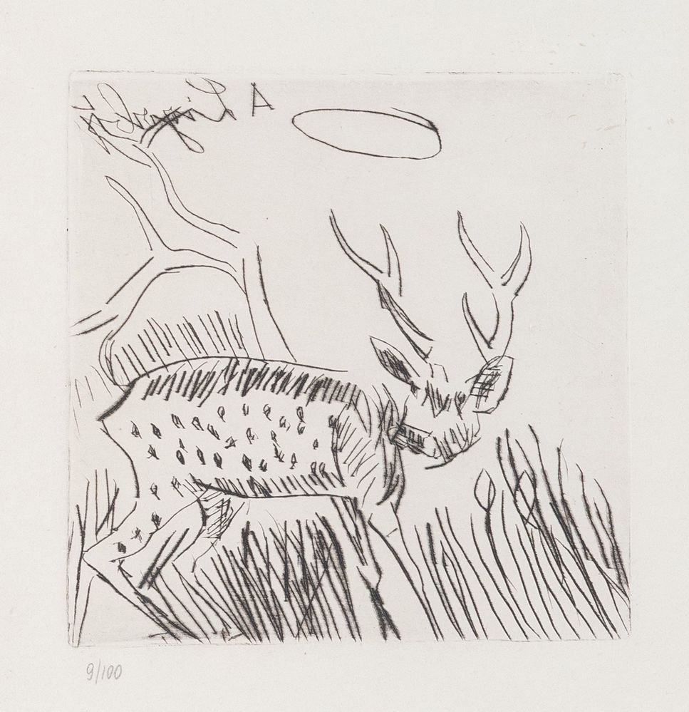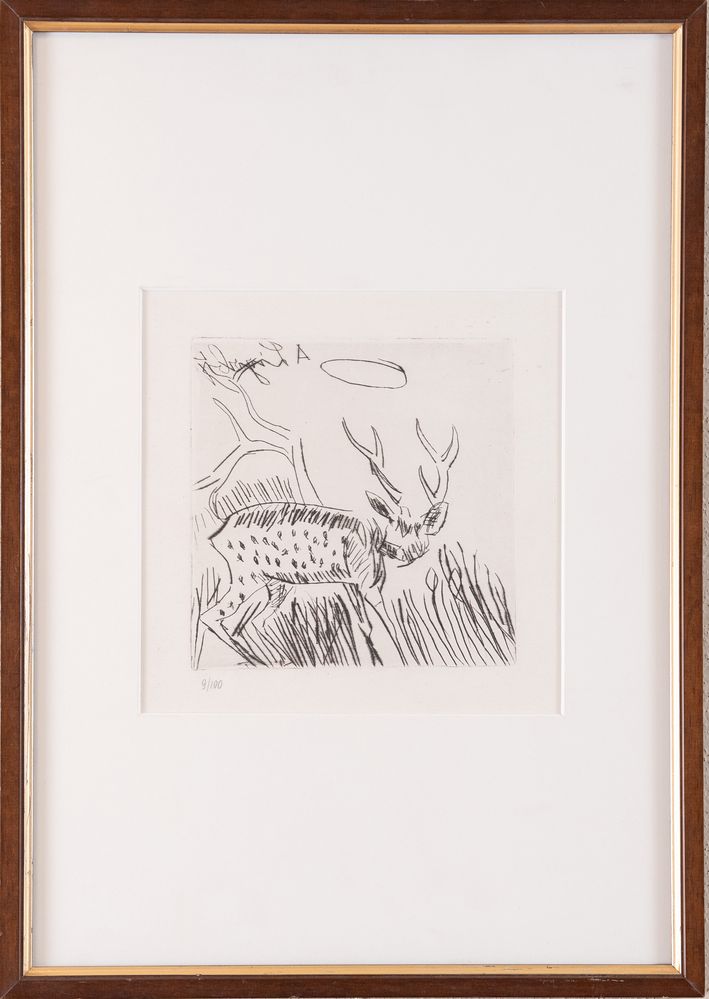 ANTONIO LIGABUE (Zurigo 1899 – Gualtieri 1965). “Cervo”. Acquaforte su carta. Lastra: cm 17,5x17,5. Foglio: cm 44,5x31,5. Numeri di tiratura in basso a sinistra 9/100. Al retro reca etichetta e timbro per autentica della Galleria d’arte Caldarese di Bologna.
