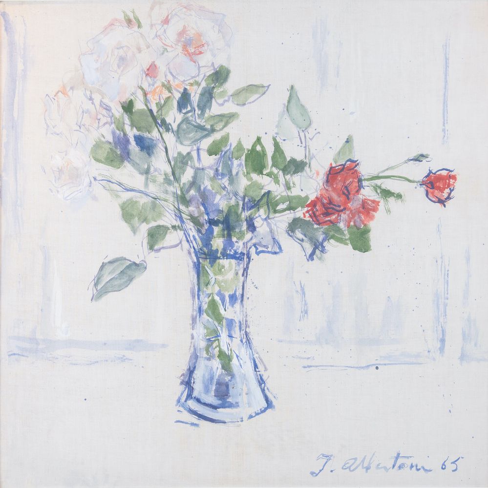 FILIPPO ALBERTONI (Reggio Emilia 1930 - Bologna 2011) "Vaso di fiori", 1965. Olio su tela. Cm 65x66. Opera firmata e datata F. Albertoni 65.